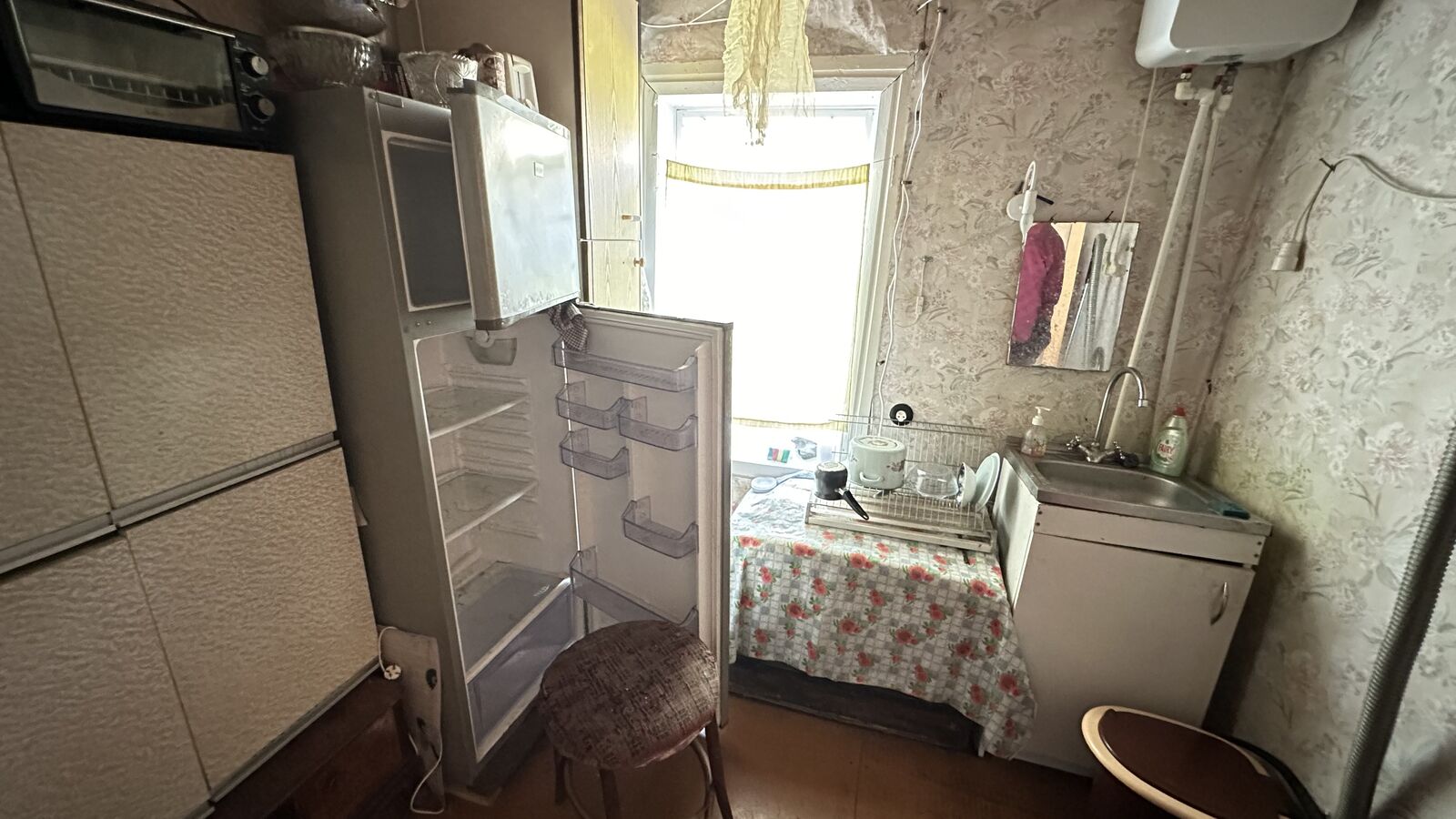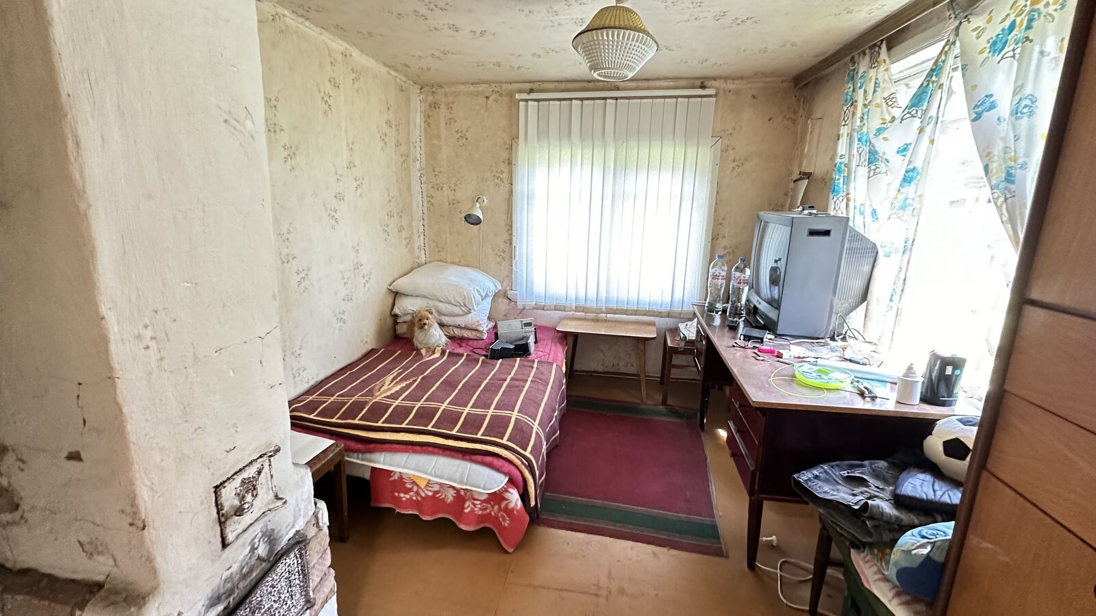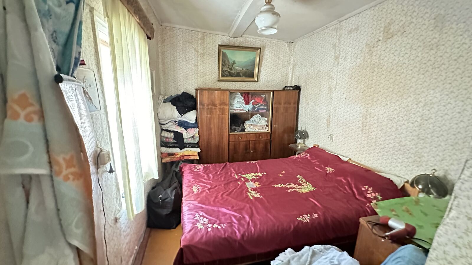 Дом 50-х г.п., в нем продается ½ доля (по площади 50 кв.м.), которая состоит из бревенчатой кухни и двух комнат. Отапливается печкой, подведено электричество и центральный водопровод, а газопровод рядом (возможно подключение).