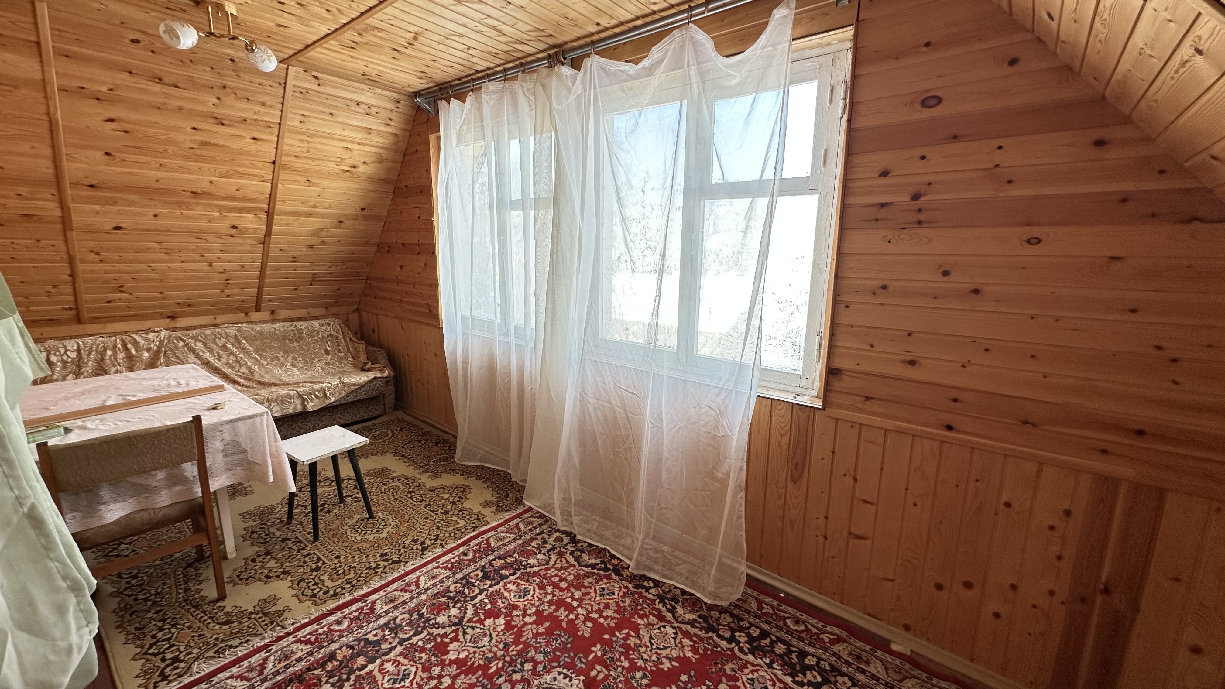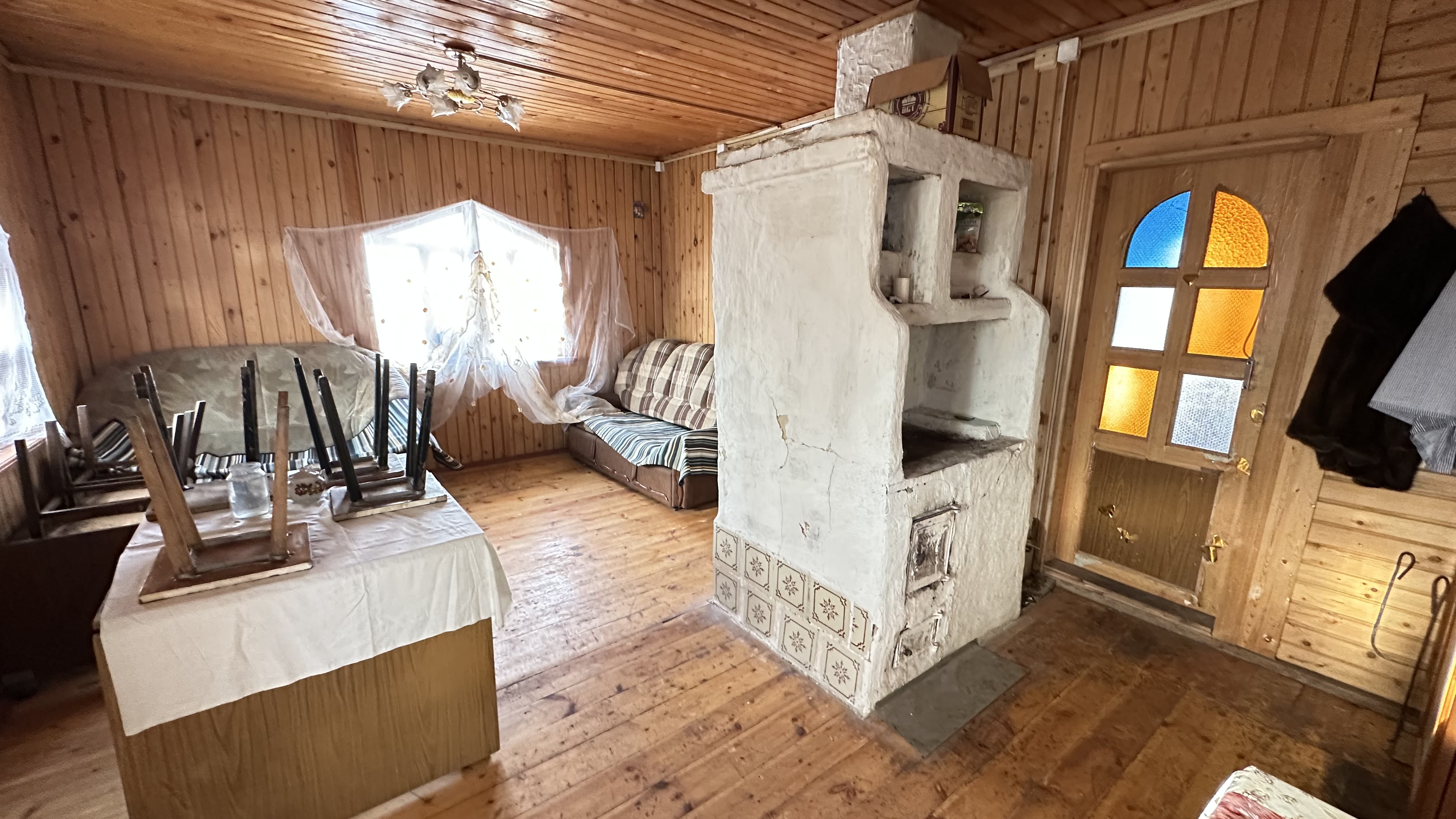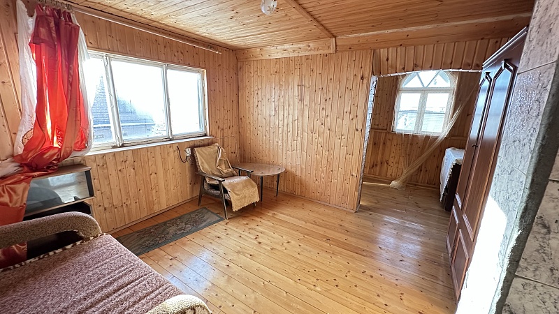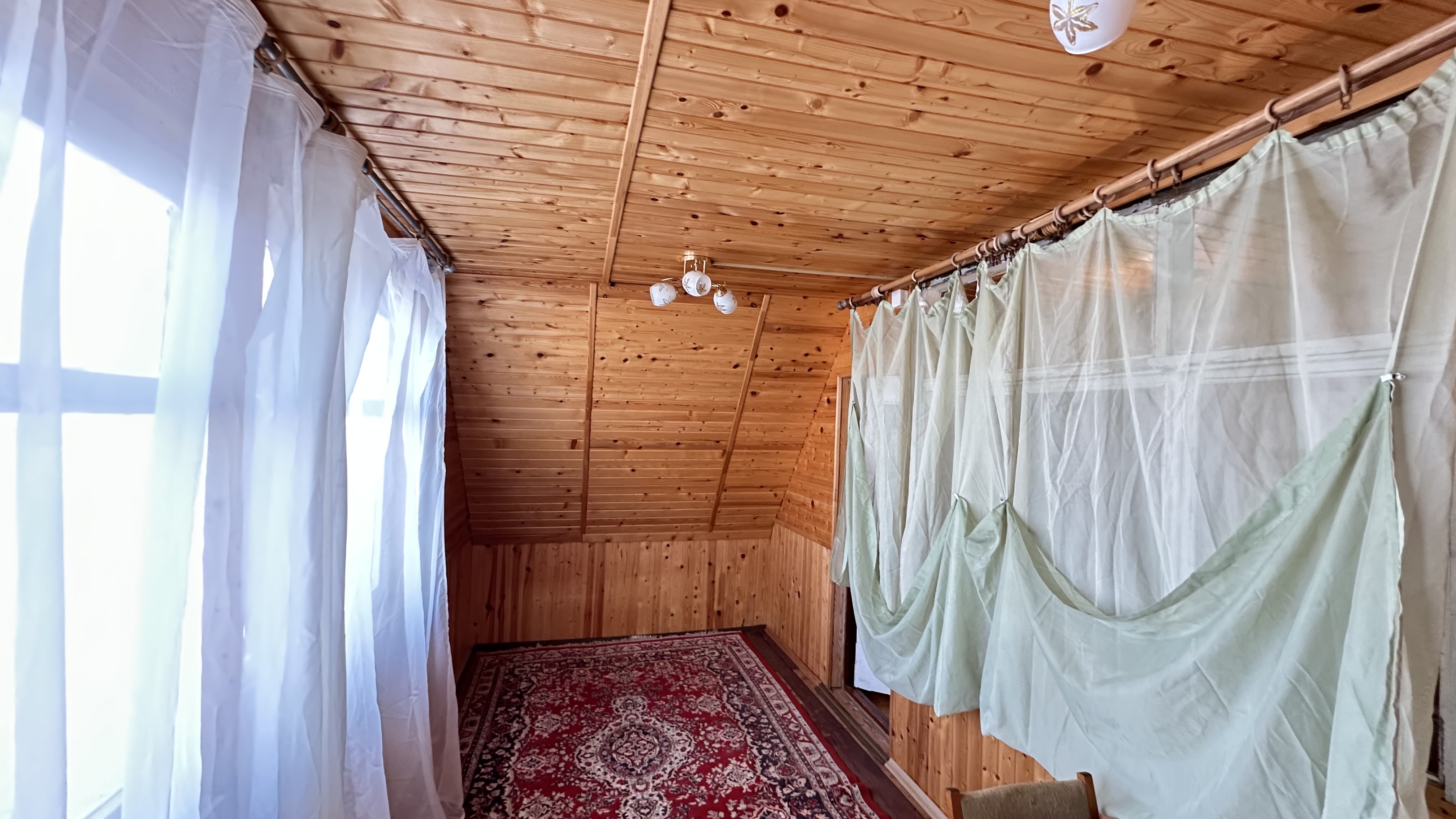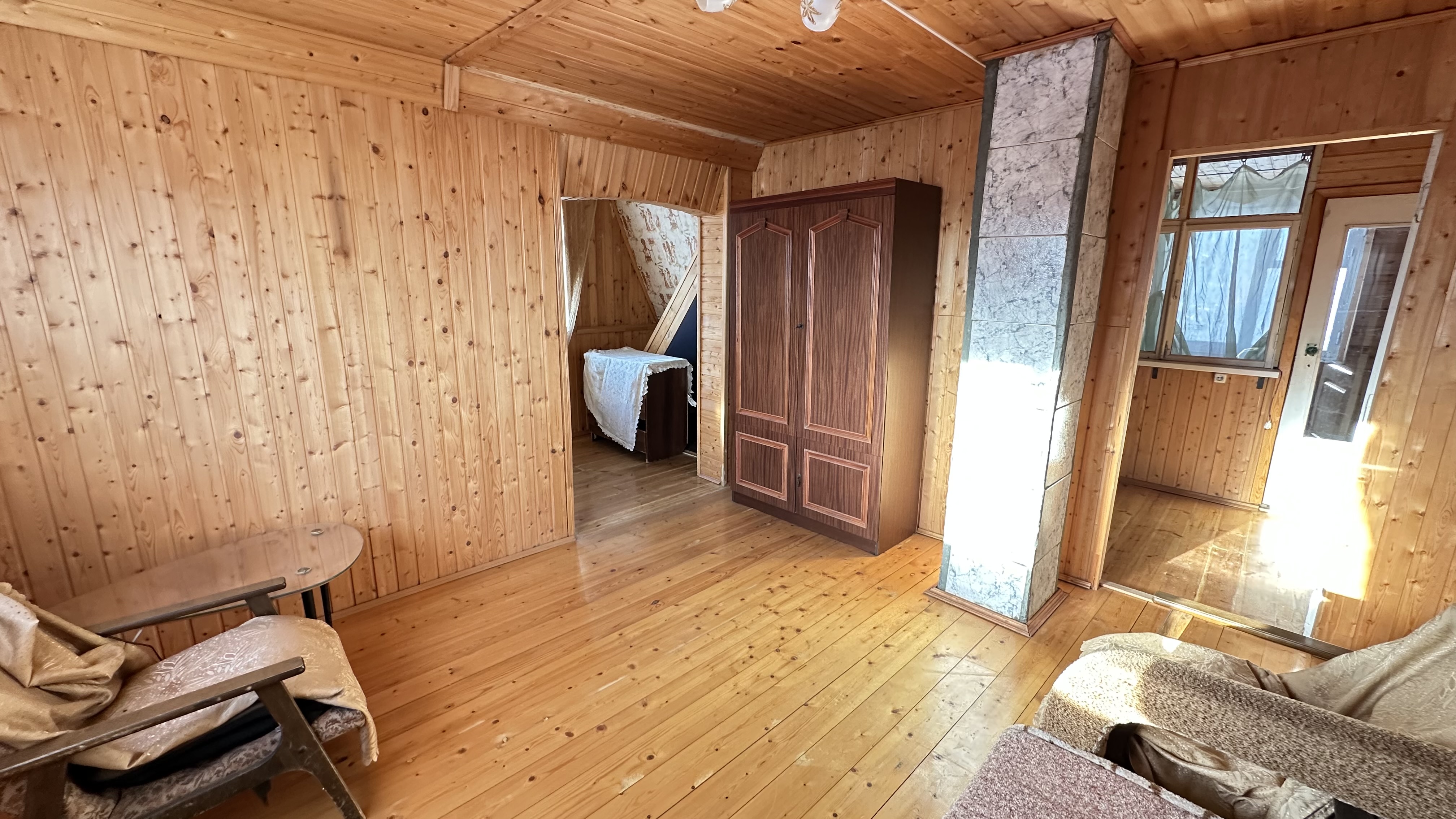 Дом 2006 года постройки, площадью 50 кв.м. (без террасы), бревенчатый, 2-х этажный, на ленточном фундаменте. По планировке: на 1-м этаже: терраса, холл с лестницей на 2-й этаж, большая комната с печкой; на мансарде: холл и две изолированные комнаты.