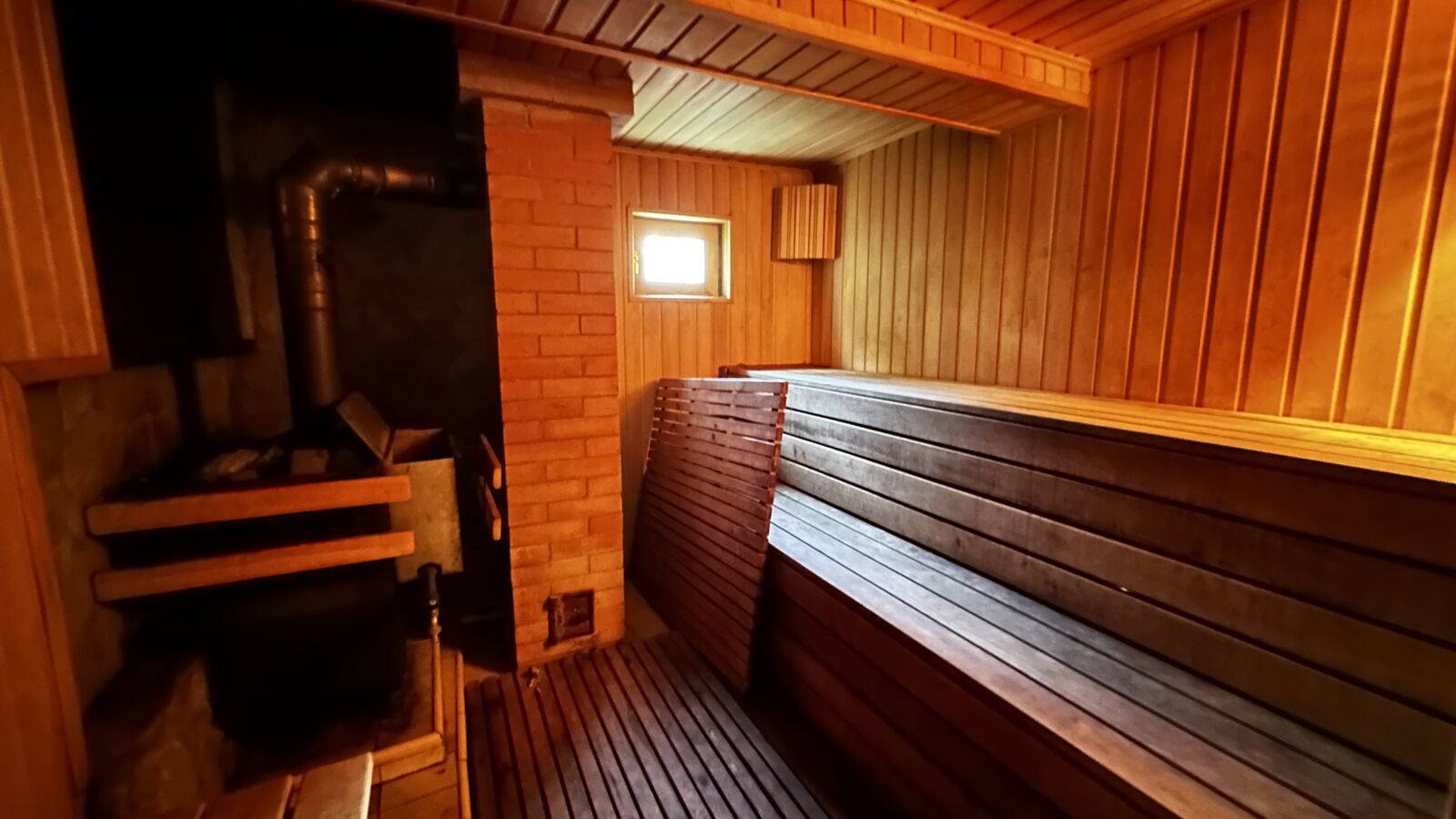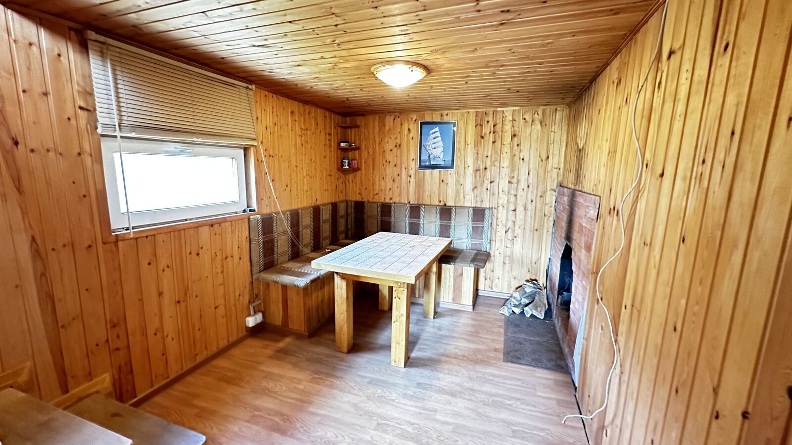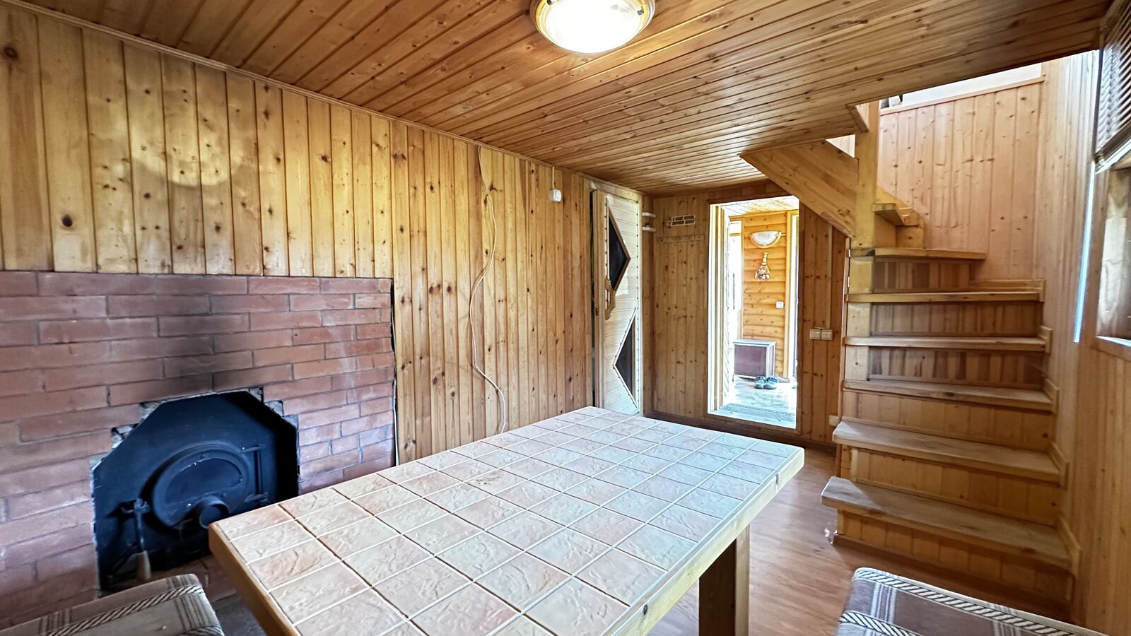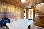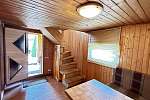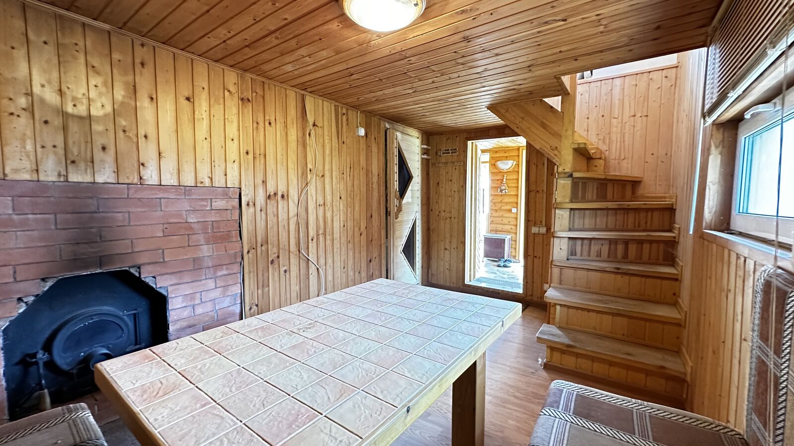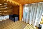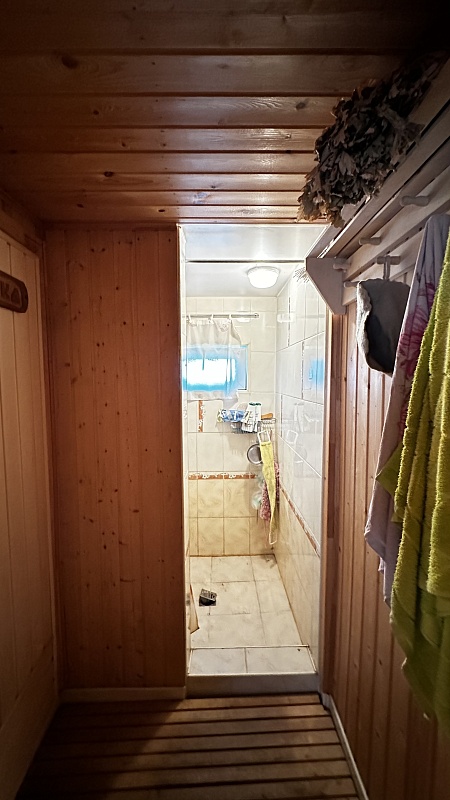 Внутри стены на первом этаже обшиты выгонкой, пол-ламинат, на втором этаже стены выровнены и поклеены обои, пол-ламинат. Окна в доме-бани установлены пластиковые. Печь в парной на дровах.