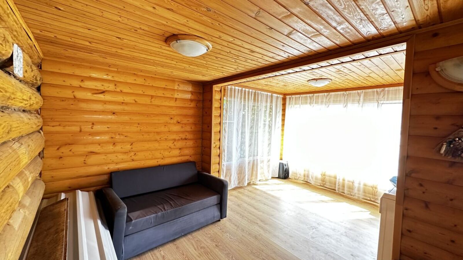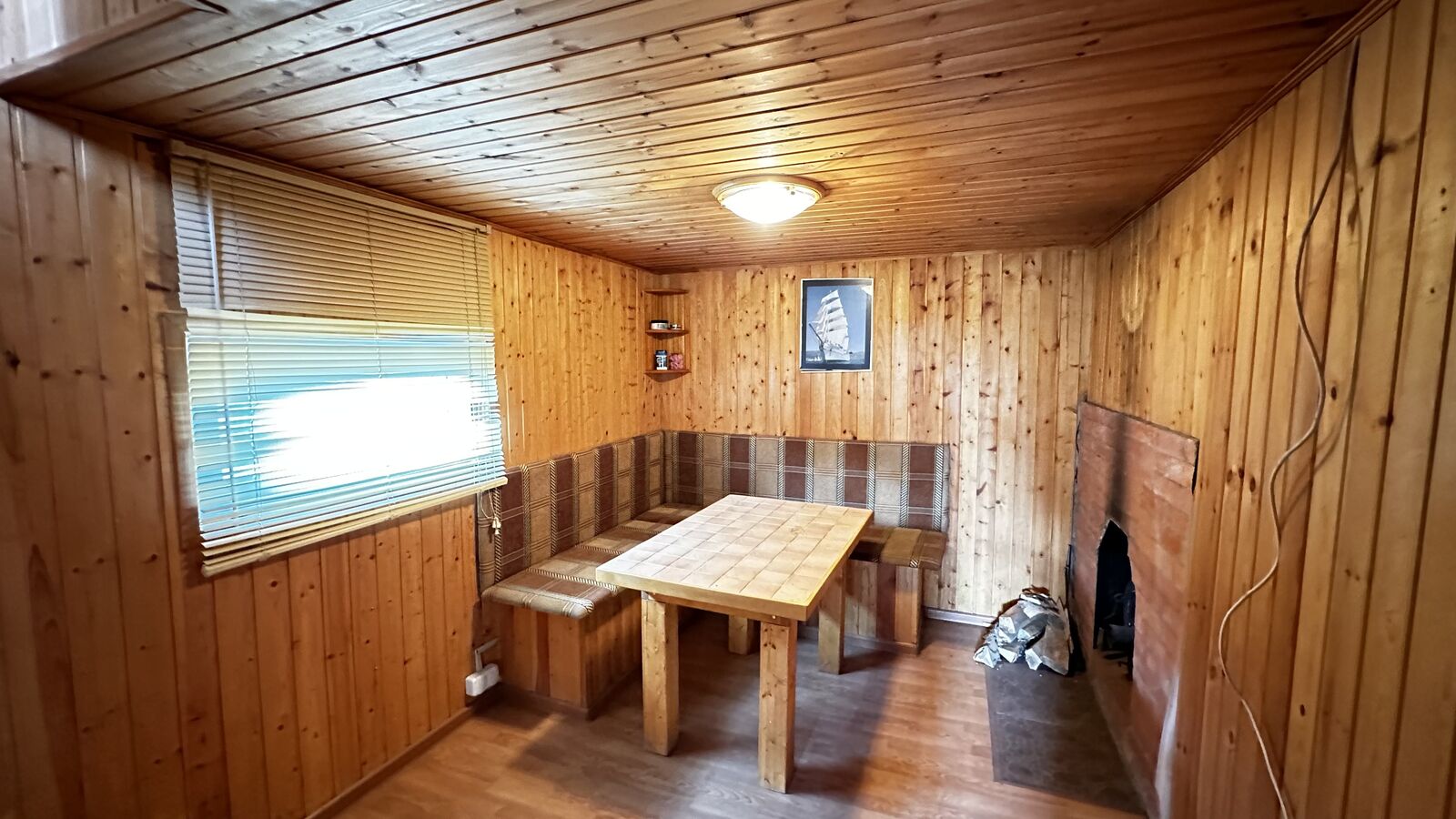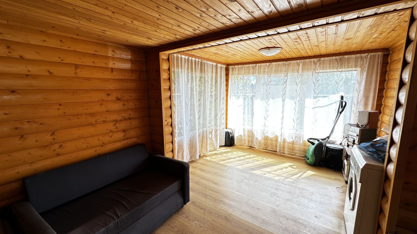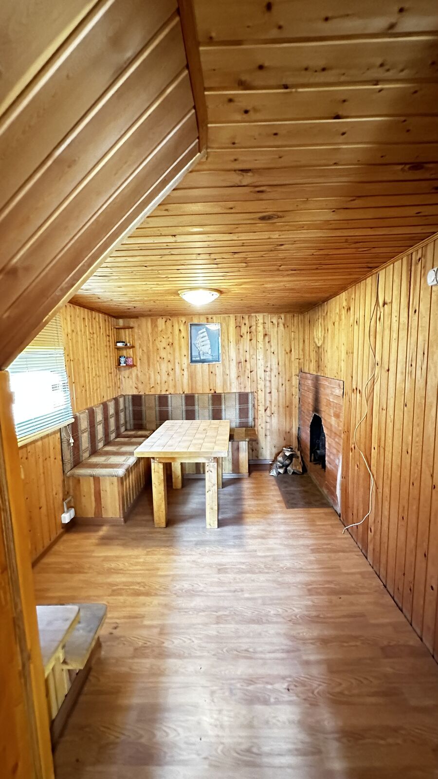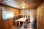 Внутри стены на первом этаже обшиты выгонкой, пол-ламинат, на втором этаже стены выровнены и поклеены обои, пол-ламинат. Окна в доме-бани установлены пластиковые. Печь в парной на дровах.