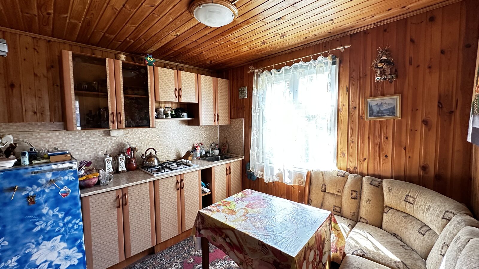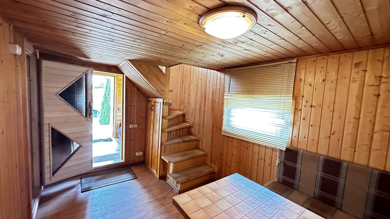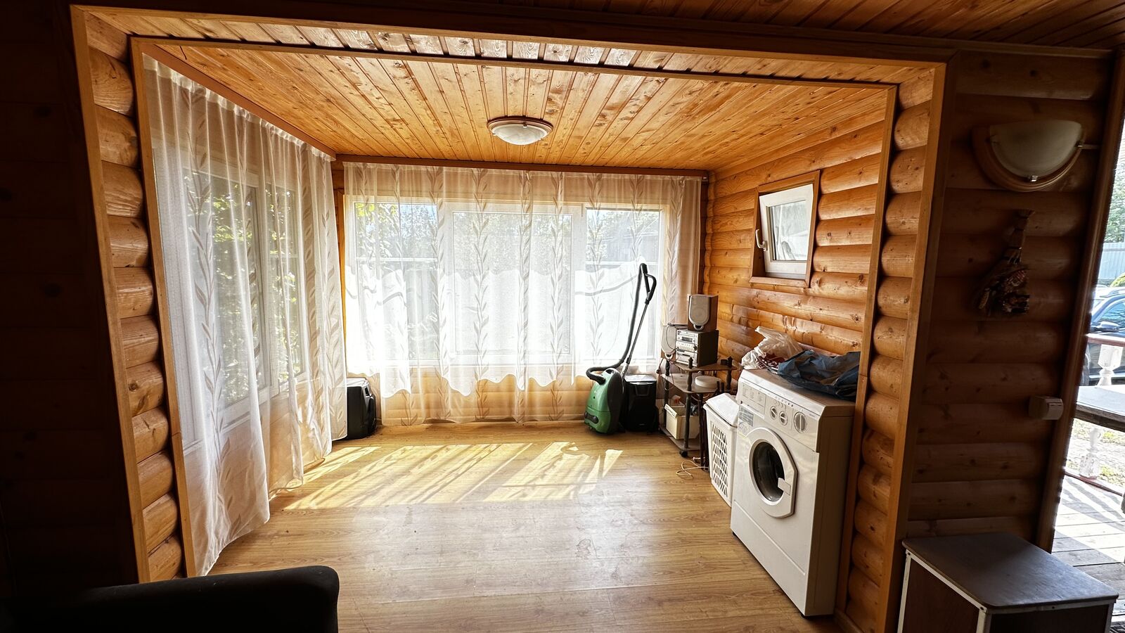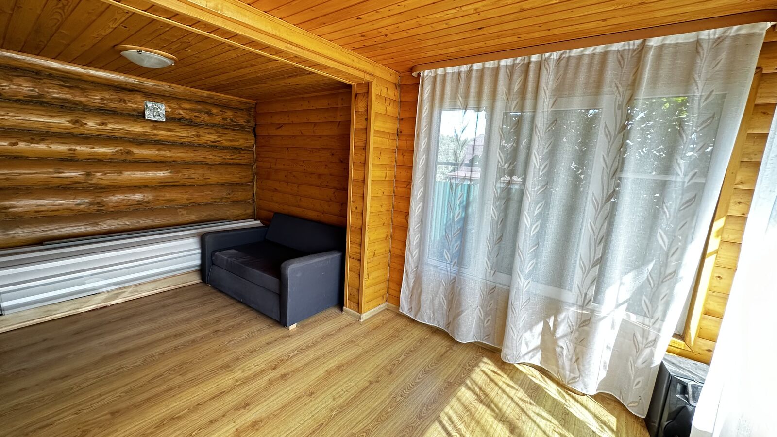 Внутри стены на первом этаже обшиты выгонкой, пол-ламинат, на втором этаже стены выровнены и поклеены обои, пол-ламинат. Окна в доме-бани установлены пластиковые. Печь в парной на дровах.