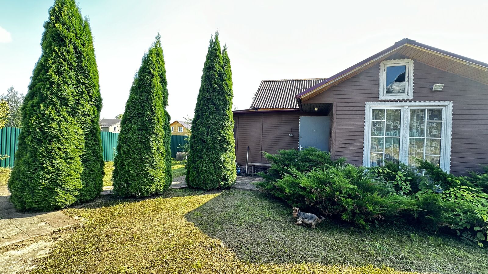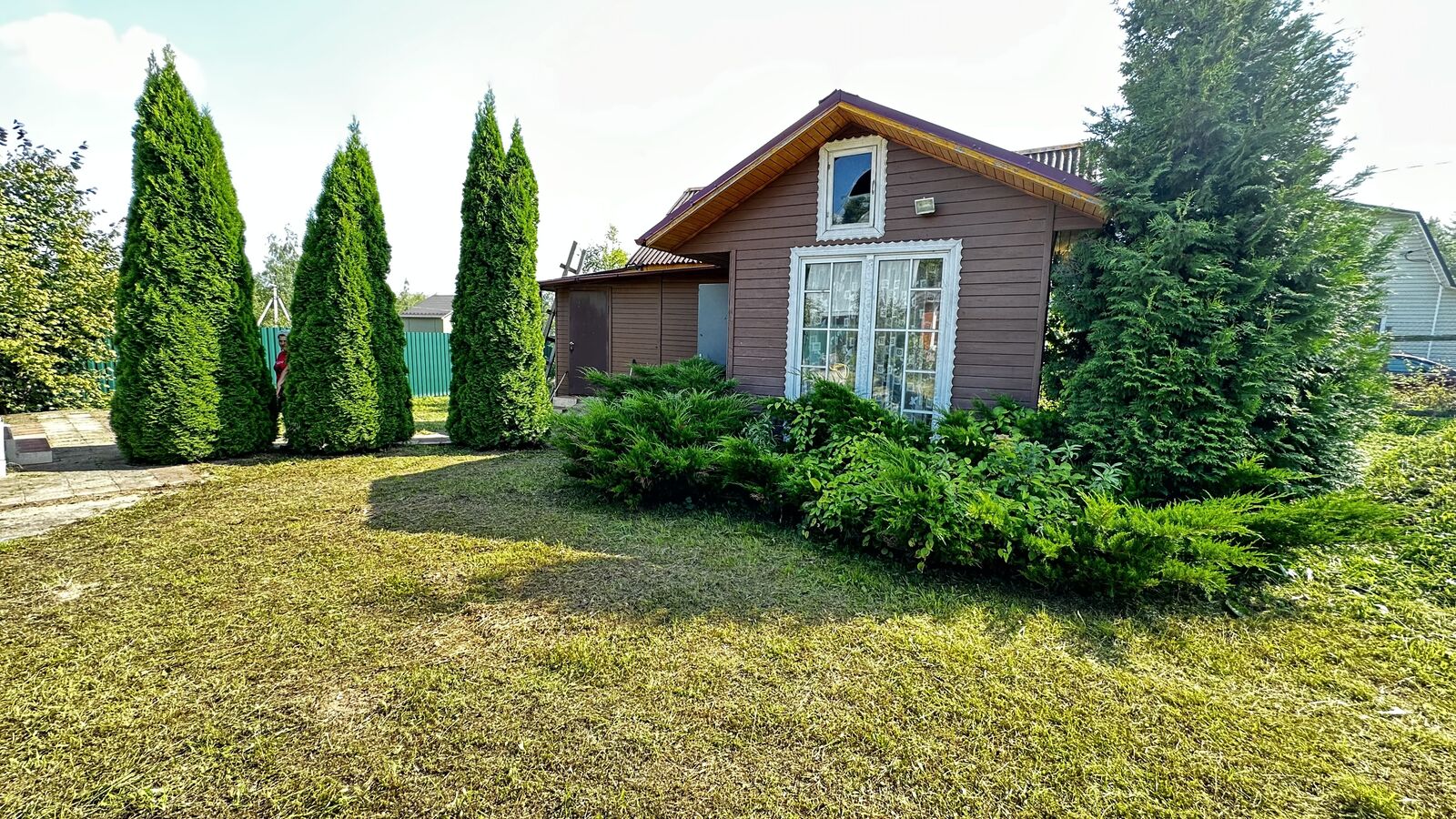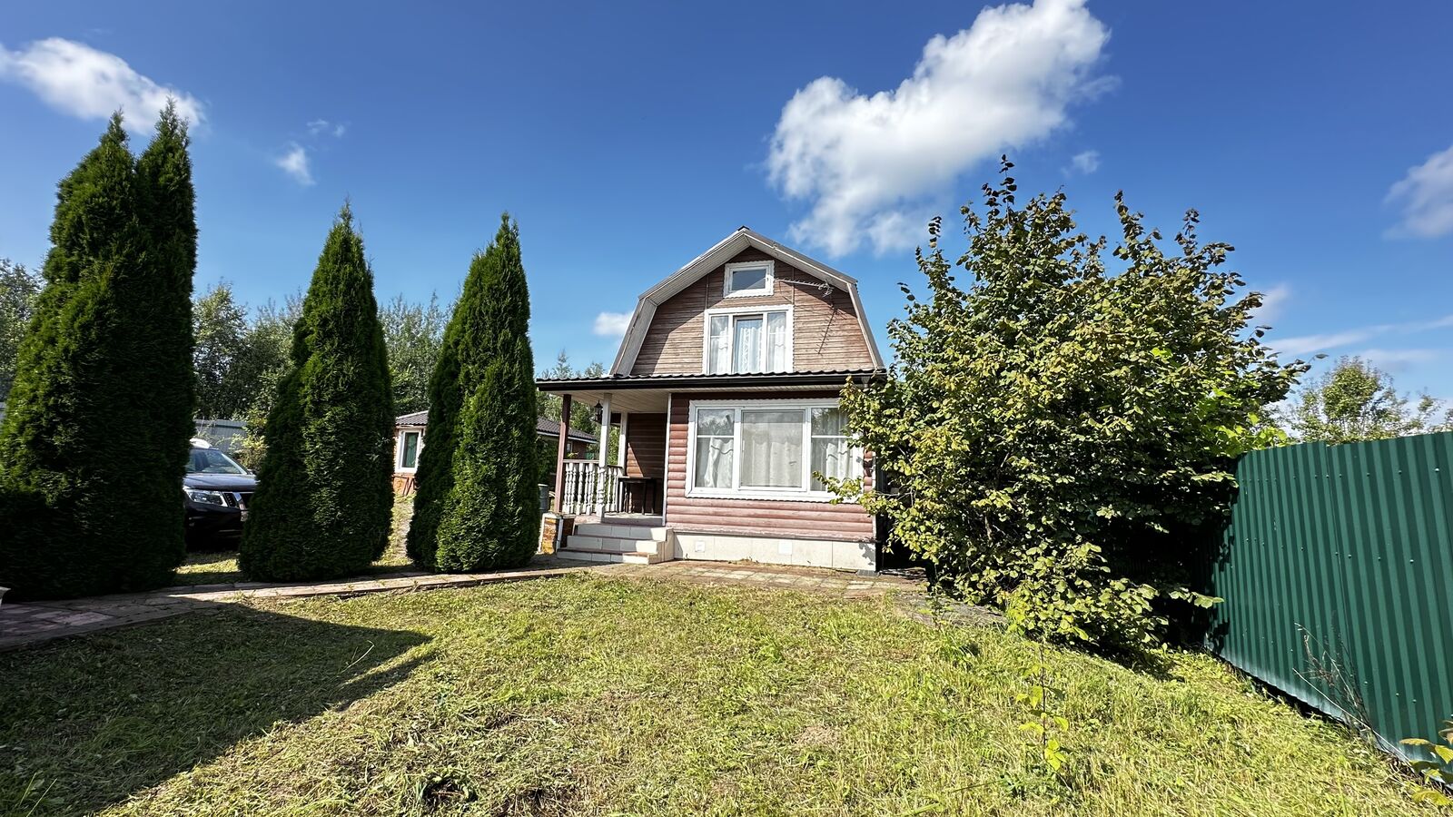 Участок 9,7 соток, ухоженный, сухой, с плодово-ягодными кустами (смородина, крыжовник, виноград) и деревьями (яблоня, слива, груша, орешник), так же есть большие туи, можжевельник и цветы. С трех сторон участок огорожен профлистом и с одной стороны сетка рабица. Сделаны ворота для въезда автомобиля. Участок с межеванием его кадастровый номер: 50:05:0140313:9