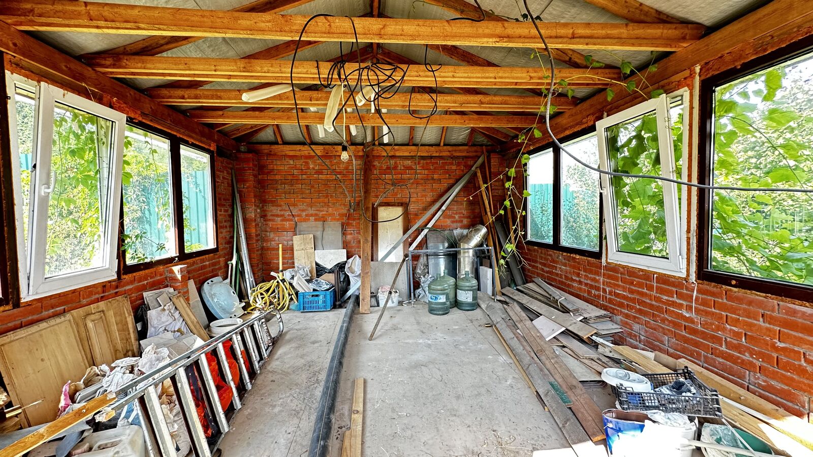 - Теплая беседка. Беседка построена на плите, из красного кирпича, вставлены пластиковые окна, кровля-металлочерепица. По проекту планировалось сделать внутри беседки мангал, для этого подготовлено место.