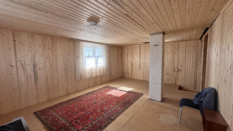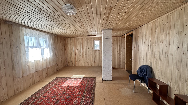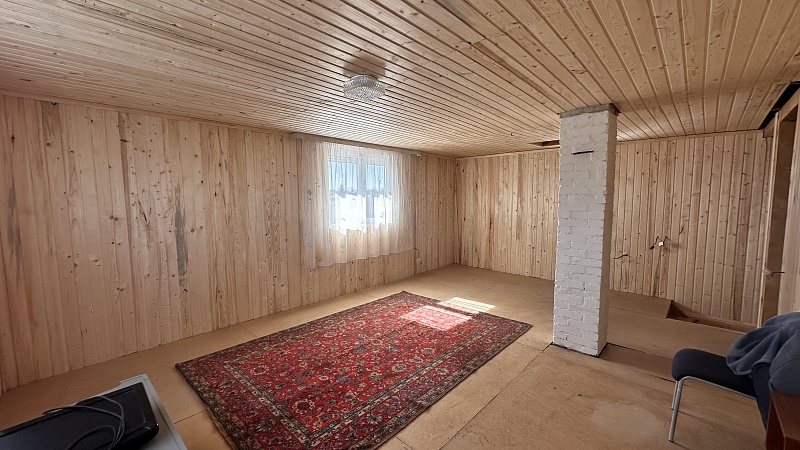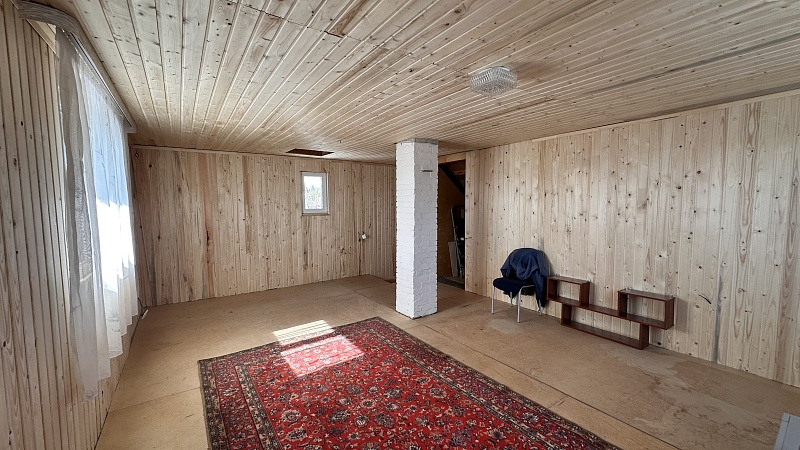 Внутри дача на первом этаже обшита вагонкой. Второй этаж не обшит, но вагонка куплена.