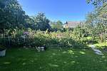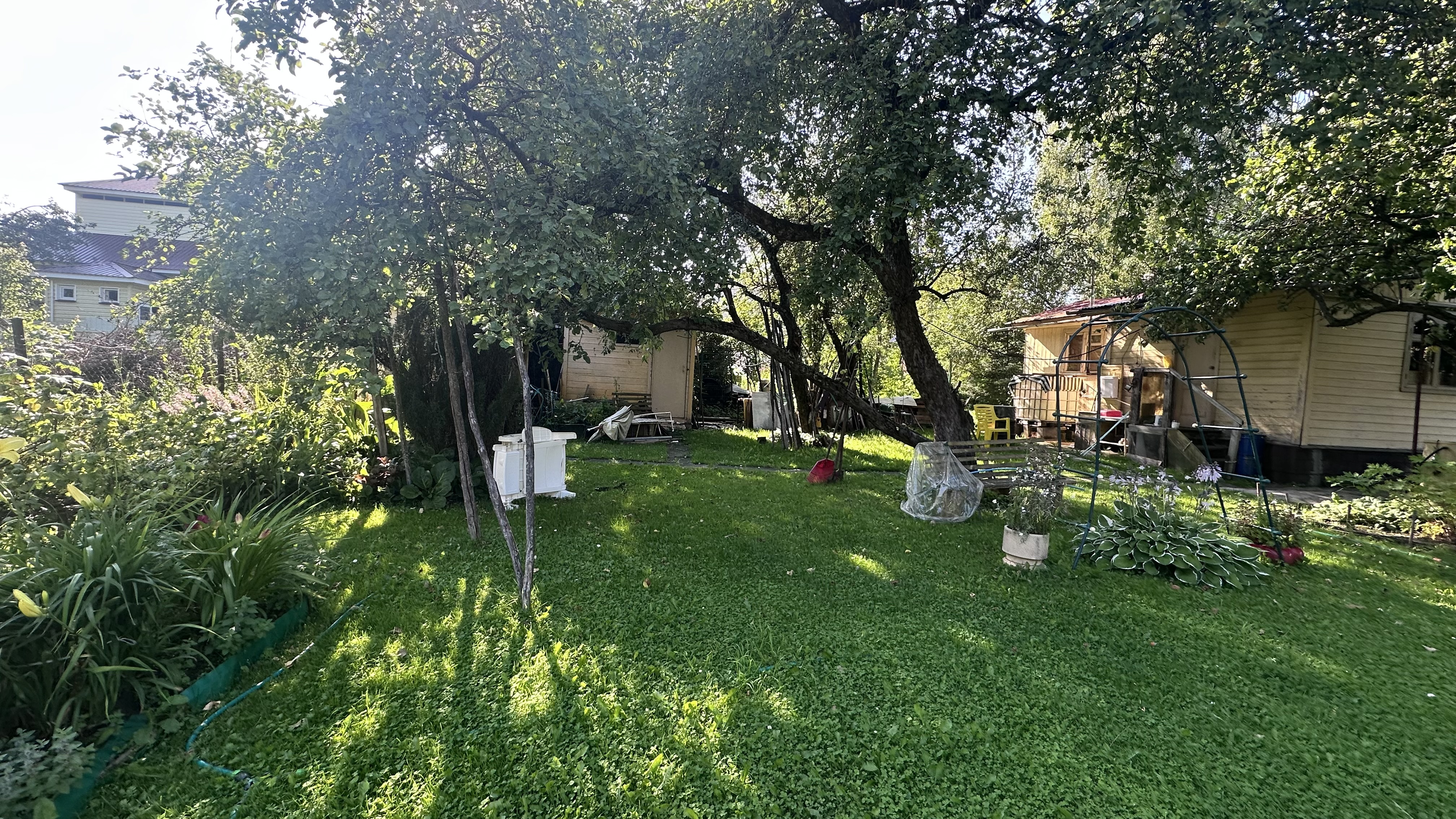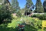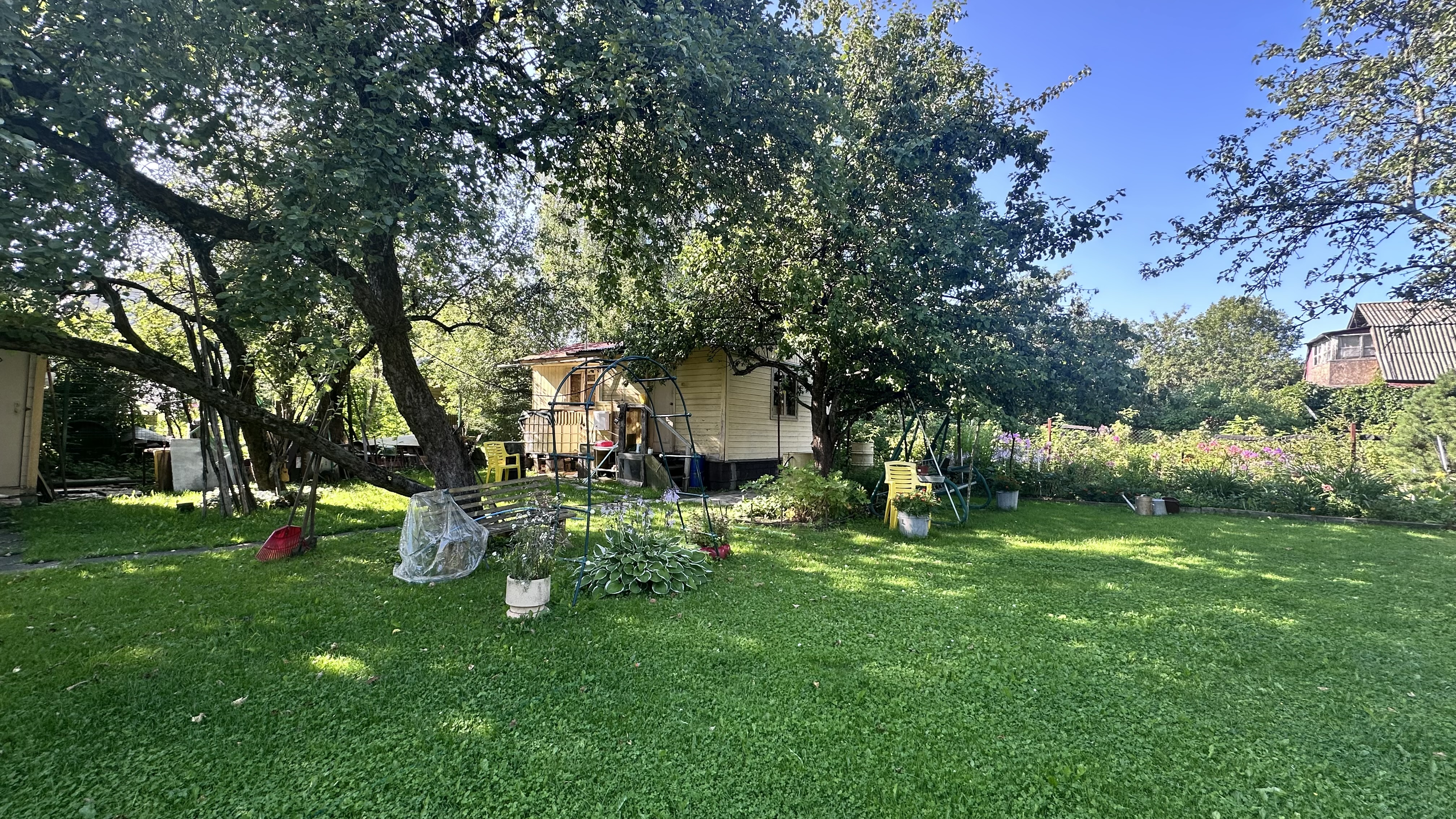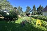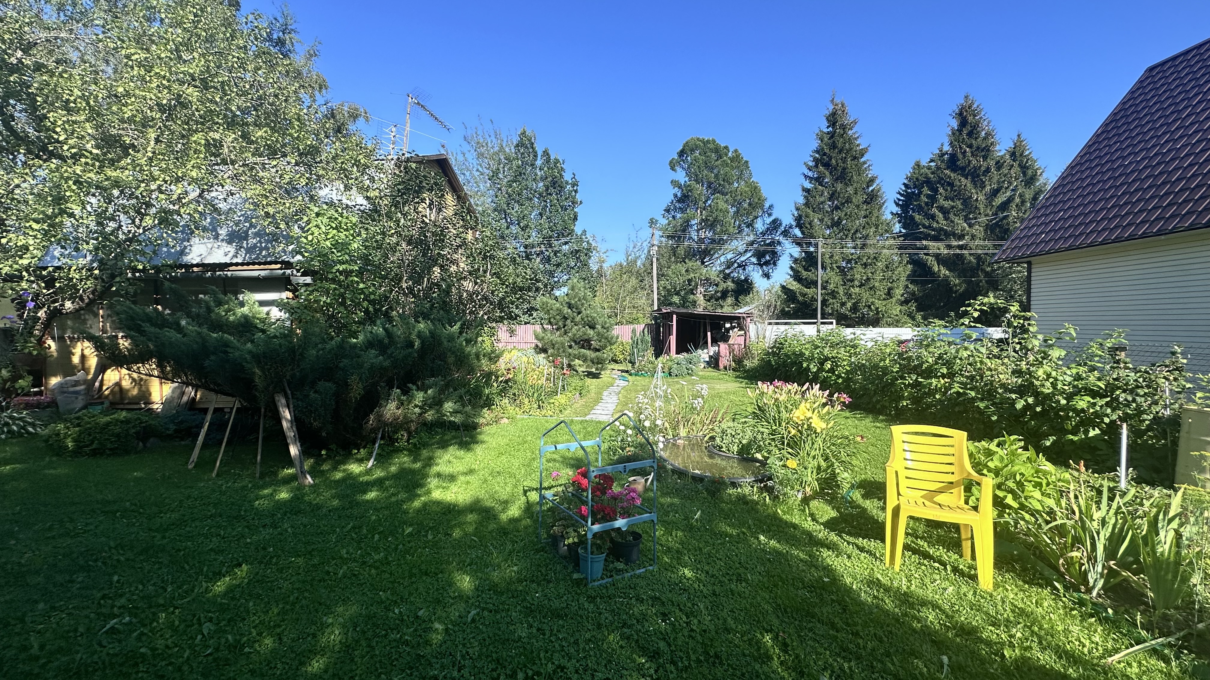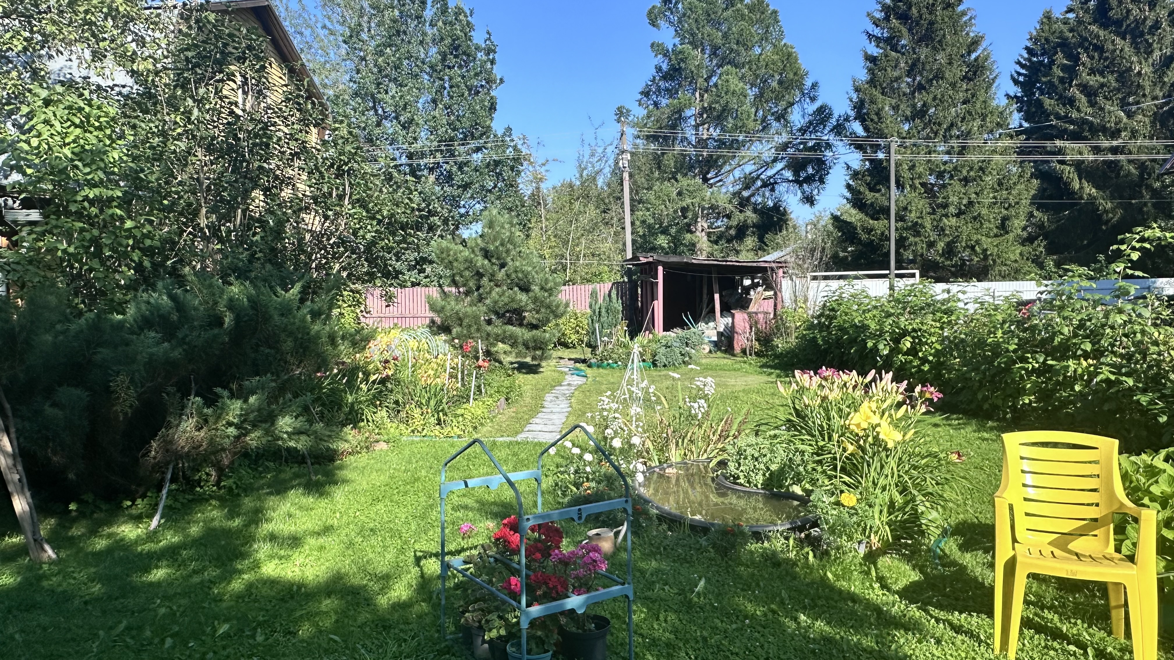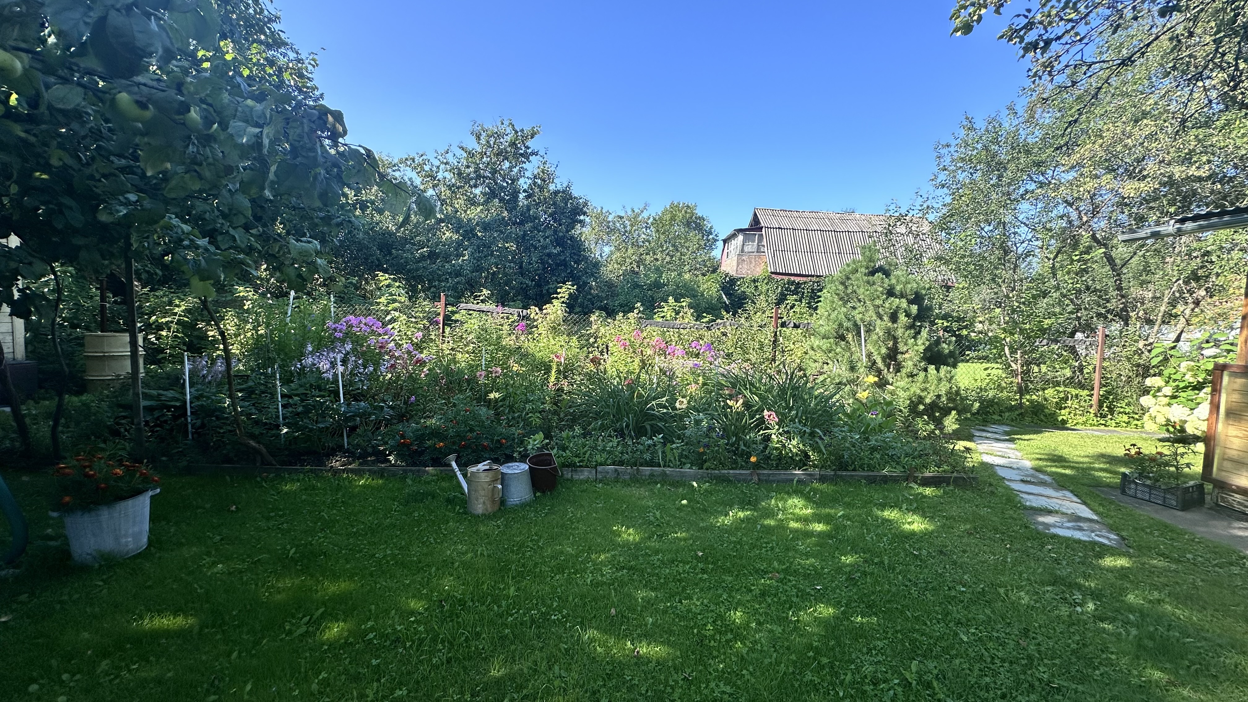 Участок 12 соток прямоугольной формы, сухой, с плодово-ягодными кустами, деревьями и большим количеством цветов. Участок огорожен с трех сторон- сетка рабица, с передней стороны- деревянный штакетник. Сделаны ворота для въезда автомобиля.