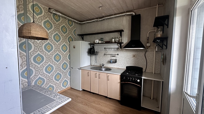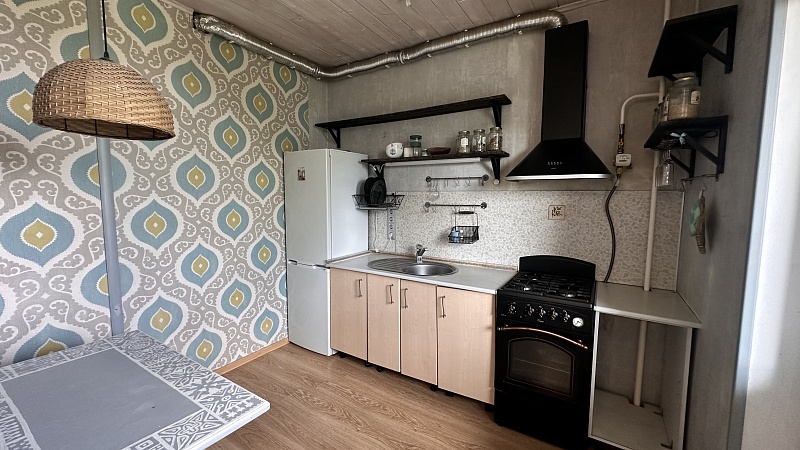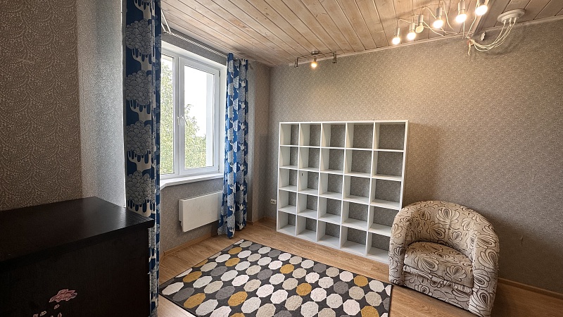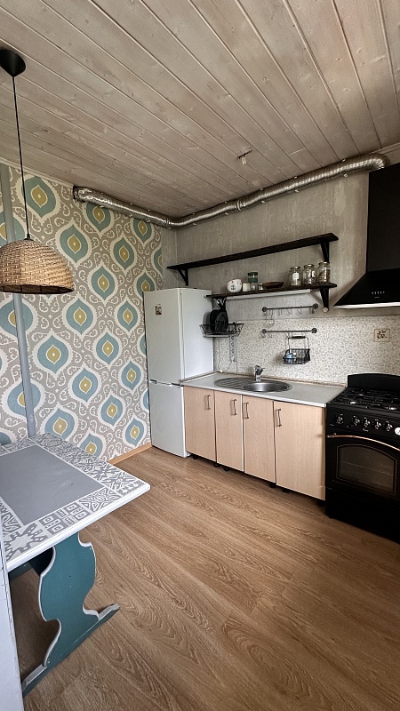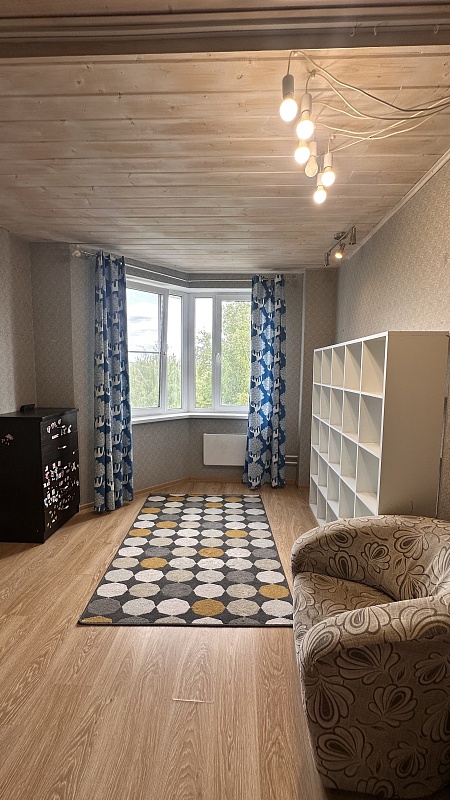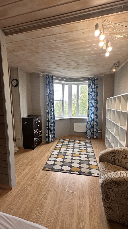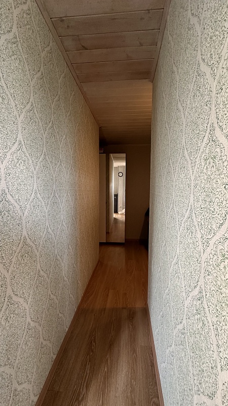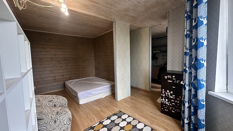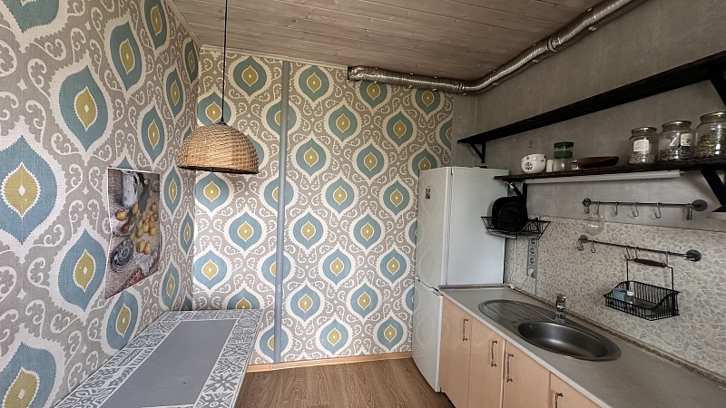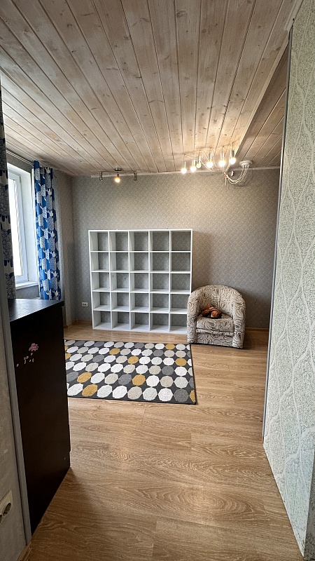 В квартире сделан ремонт в стиле дачного-прованса. На полу в коридоре при входе плитка, а дальше ламинат, в комнате и кухне ламинат, с/у на полу плитка. Потолок обшит деревом.
