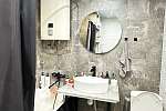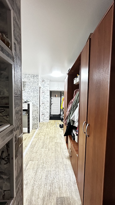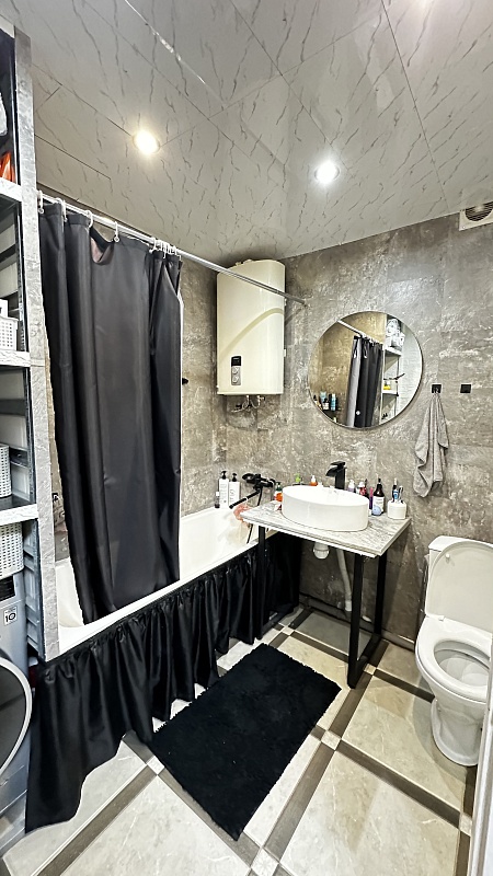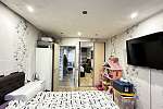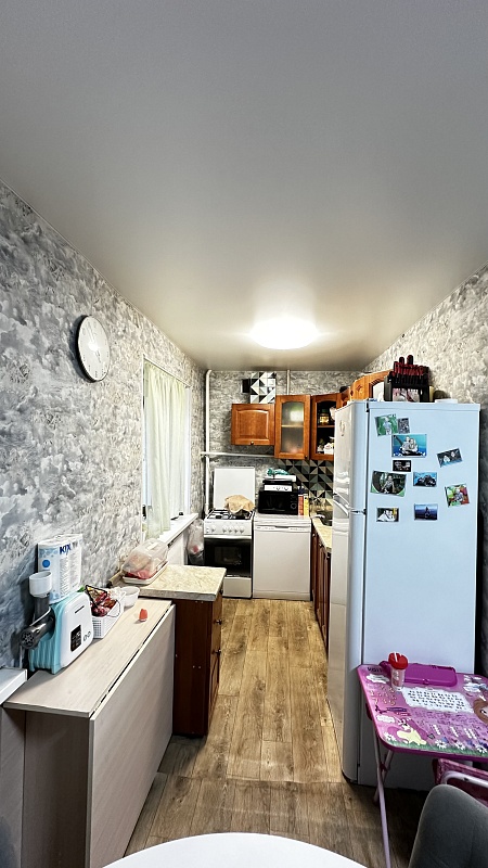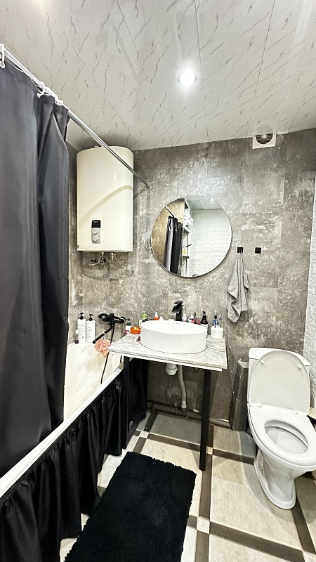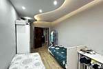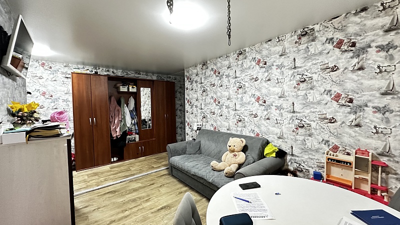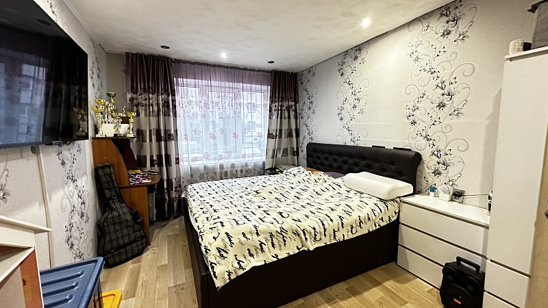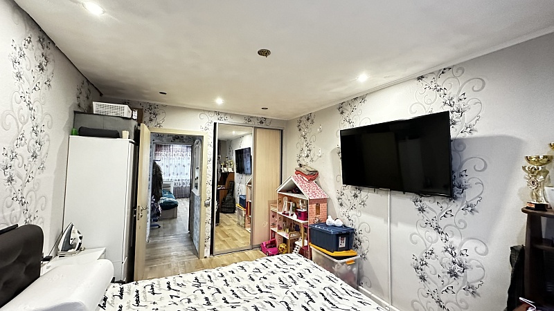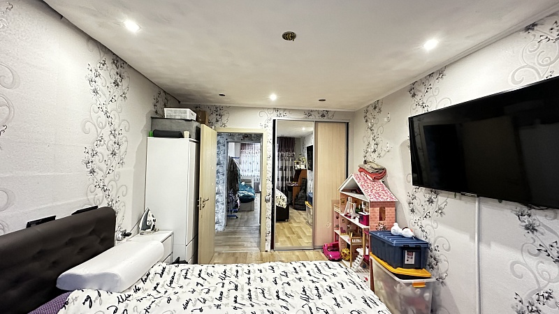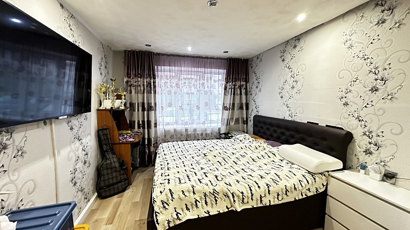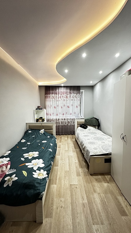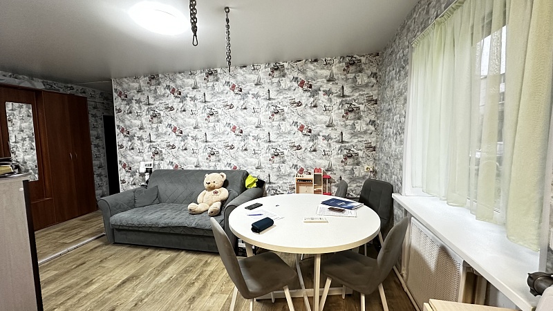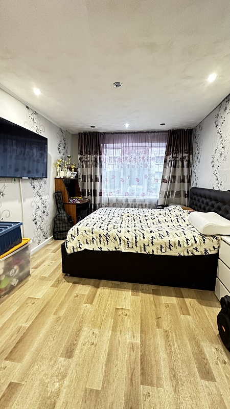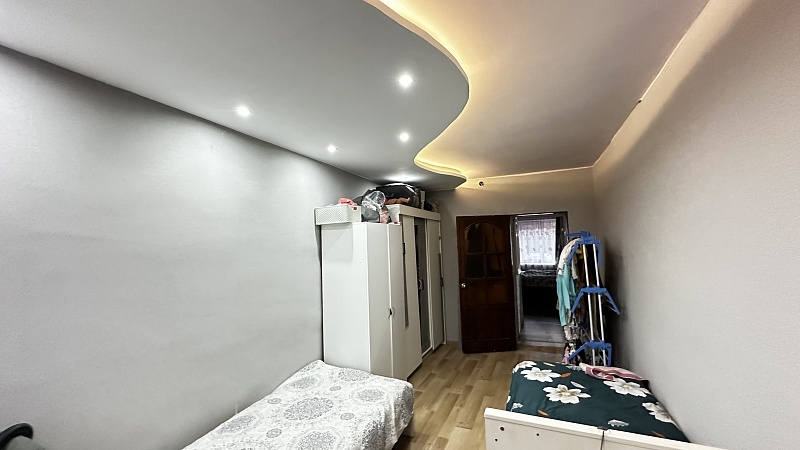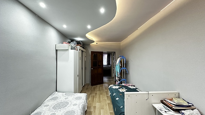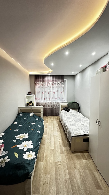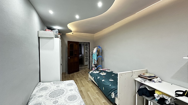 В квартире произведён хороший ремонт. Везде установили окна ПВХ, заменили всю сантехнику, электрику и водяные трубы. На полу во всей квартире линолеум, потолок-частично натяжной, частично из гипсокартонный двух уровневый со встроенными светильниками.