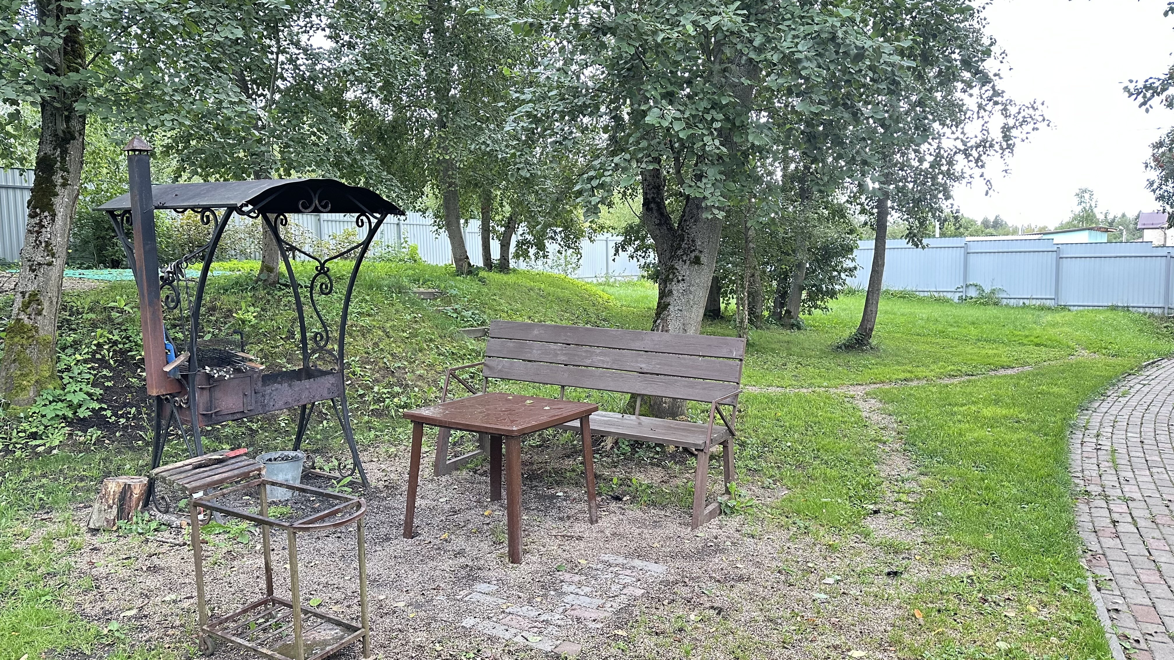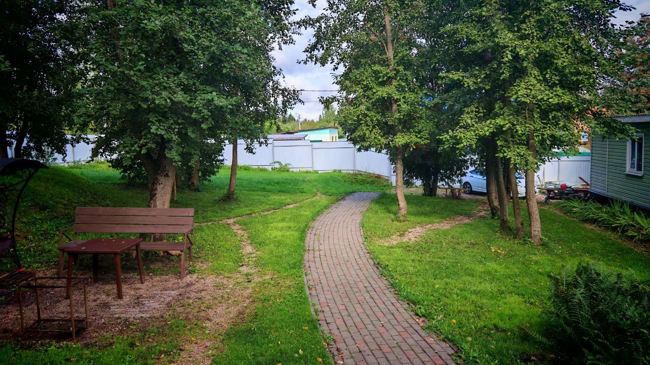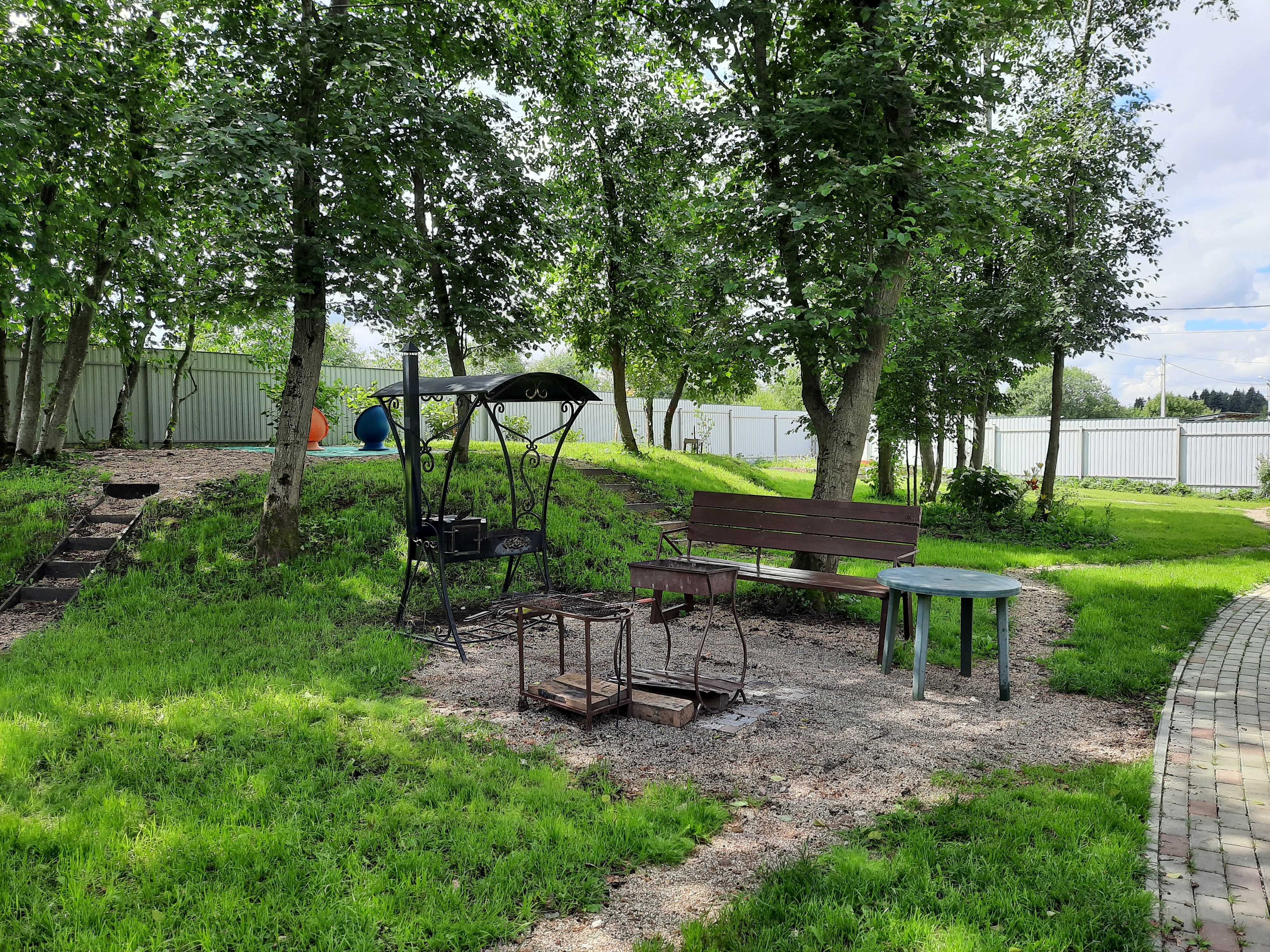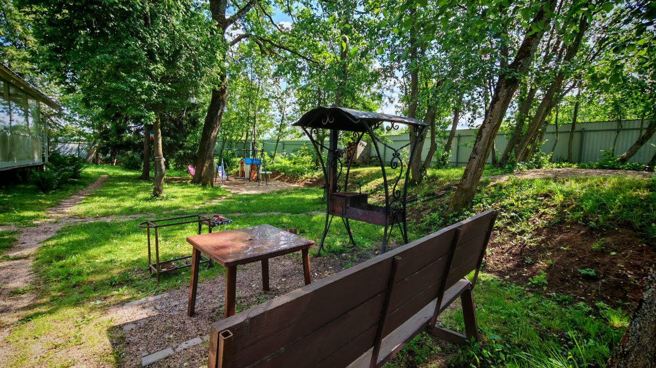 На участке взрослые лесные деревья (в том числе большой дуб), есть мангальная зона, детская площадка, открытая парковка на несколько автомобилей, небольшой огород, кусты смородины, дорожка выложена брусчаткой, огорожен сплошным забором с воротами.