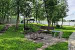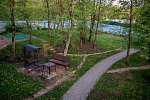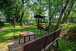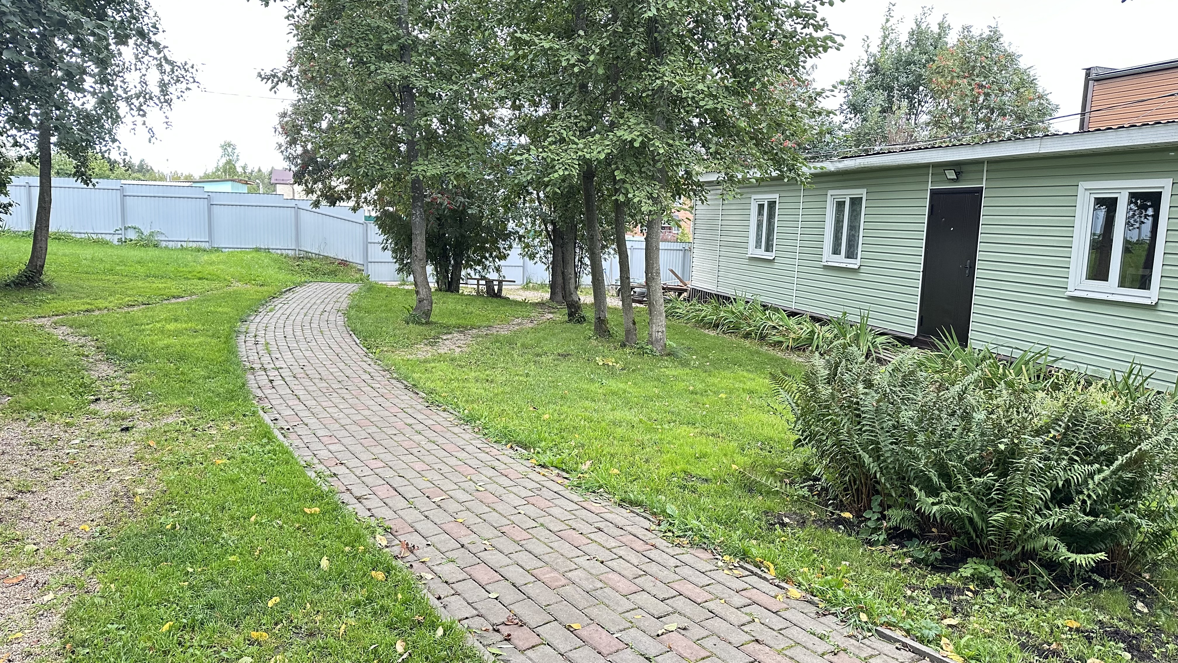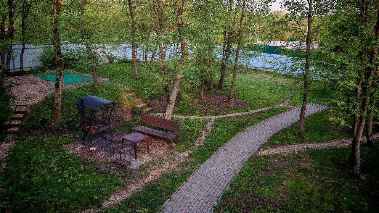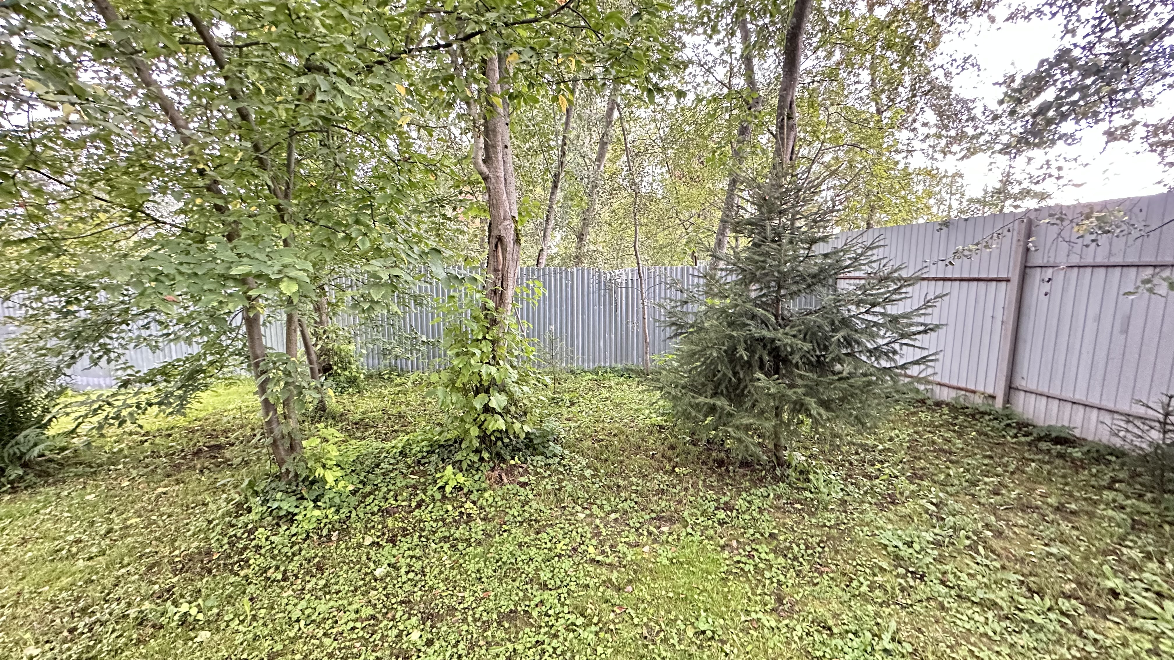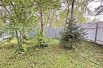 На участке взрослые лесные деревья (в том числе большой дуб), есть мангальная зона, детская площадка, открытая парковка на несколько автомобилей, небольшой огород, кусты смородины, дорожка выложена брусчаткой, огорожен сплошным забором с воротами.