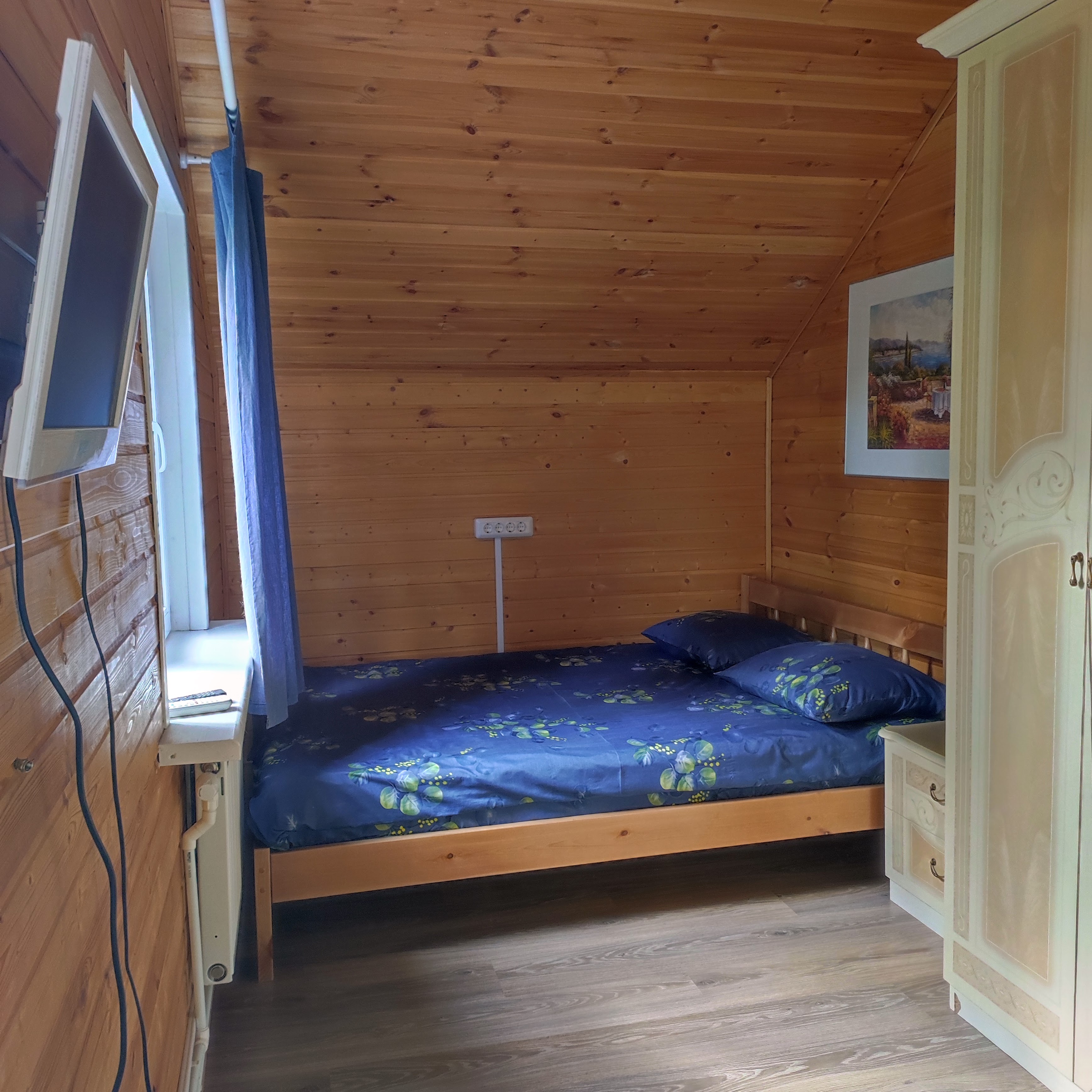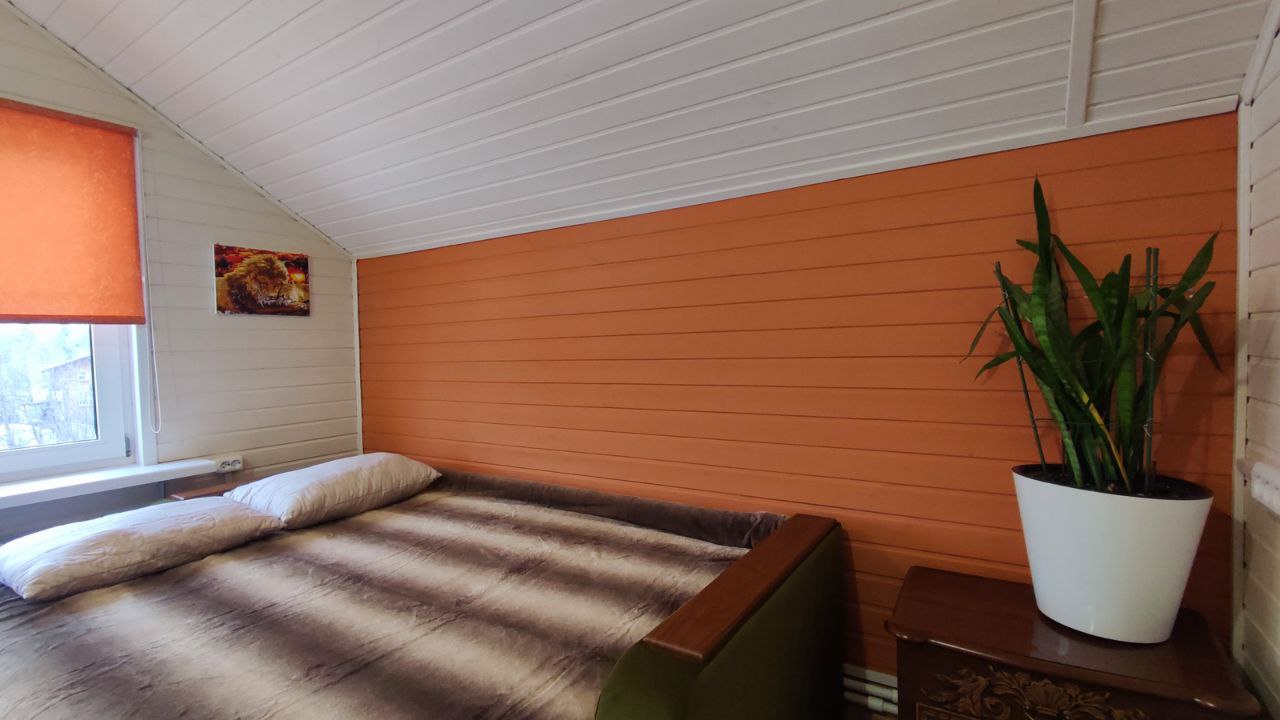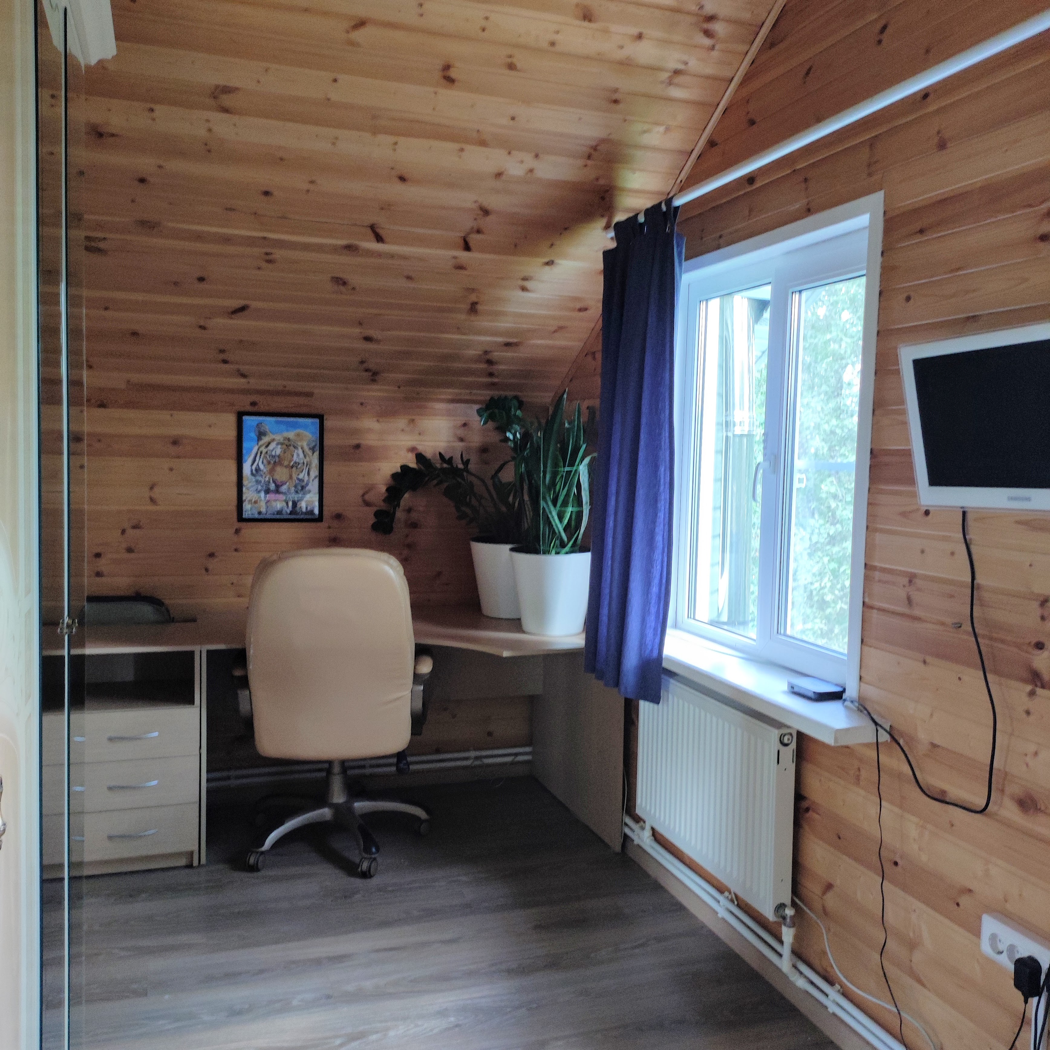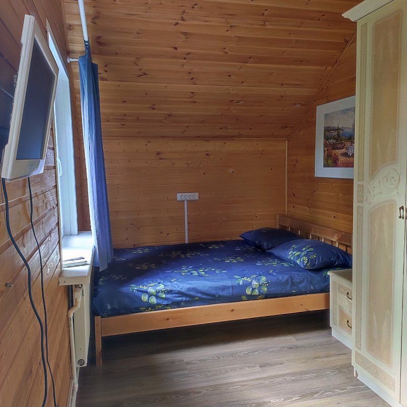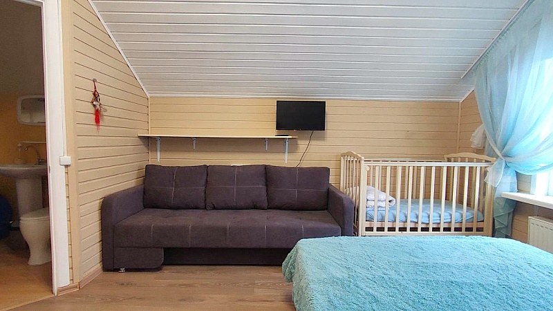 В доме: на 1 этаж: гостиная, кухня, небольшая спальня, санузел, веранда. Веранда не отапливаемая, закрытая по периметру мягкими окнами; на 2-м этаже: 3 изолированные спальни и туалет.