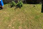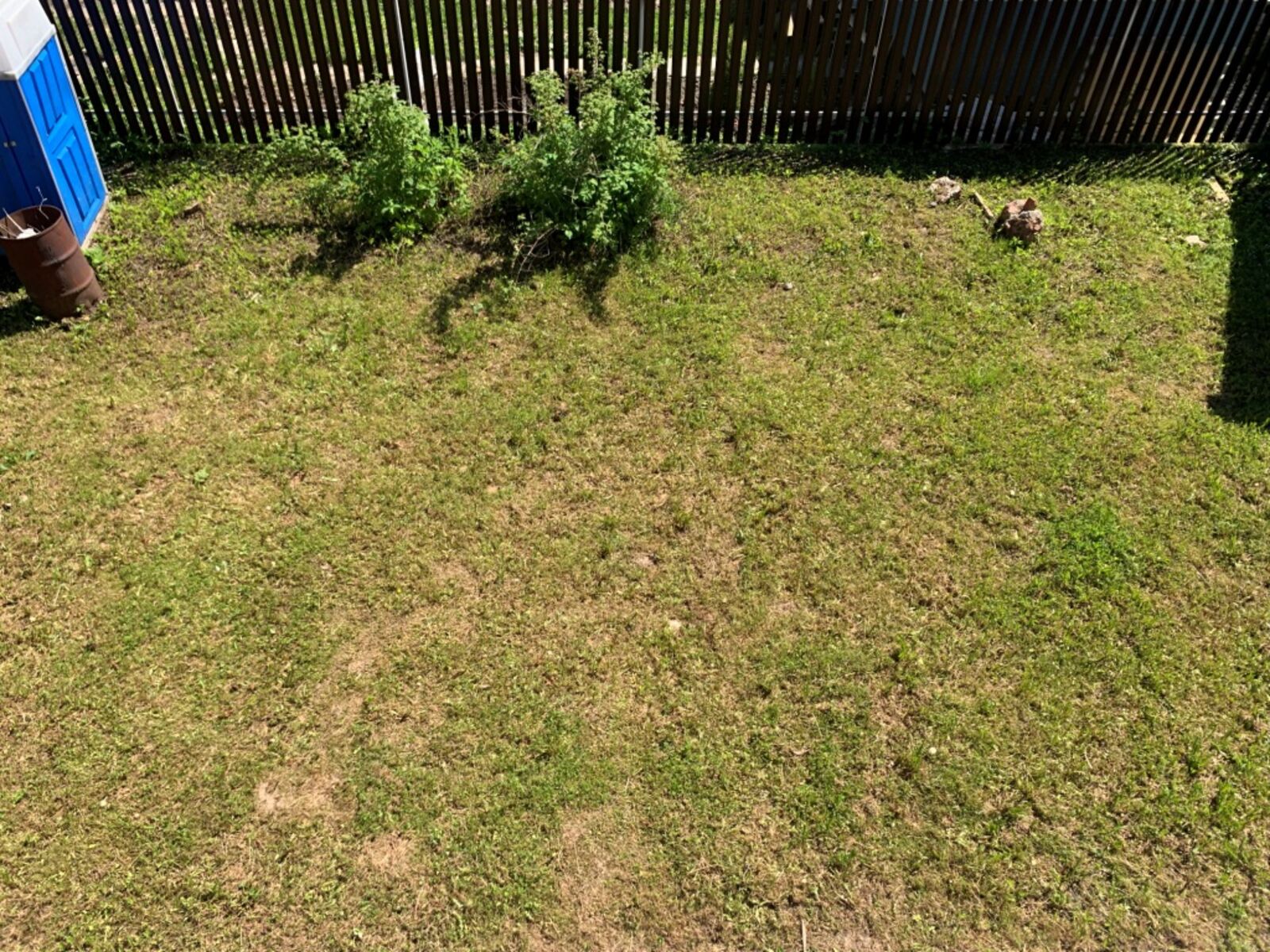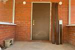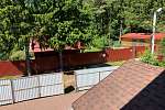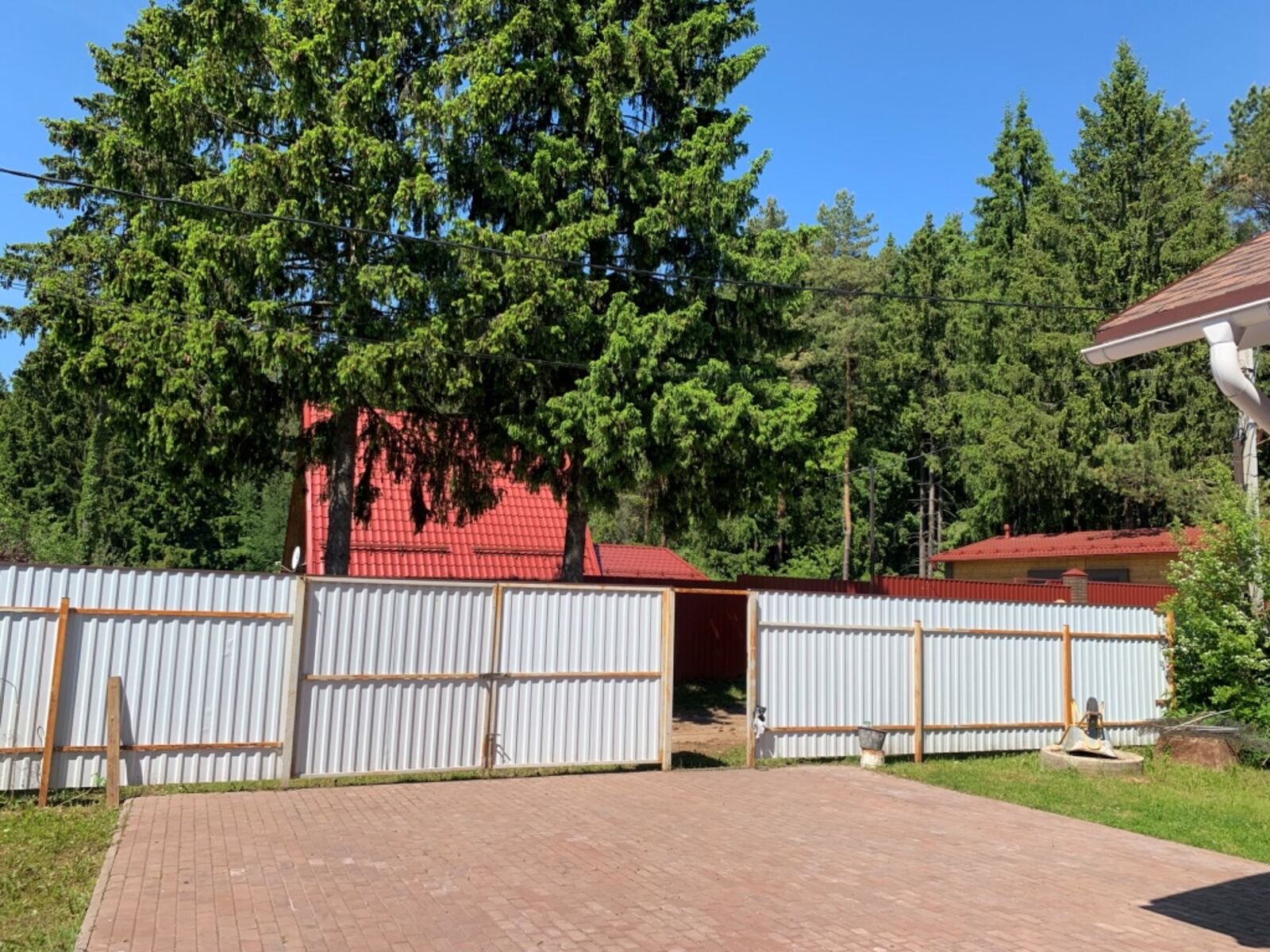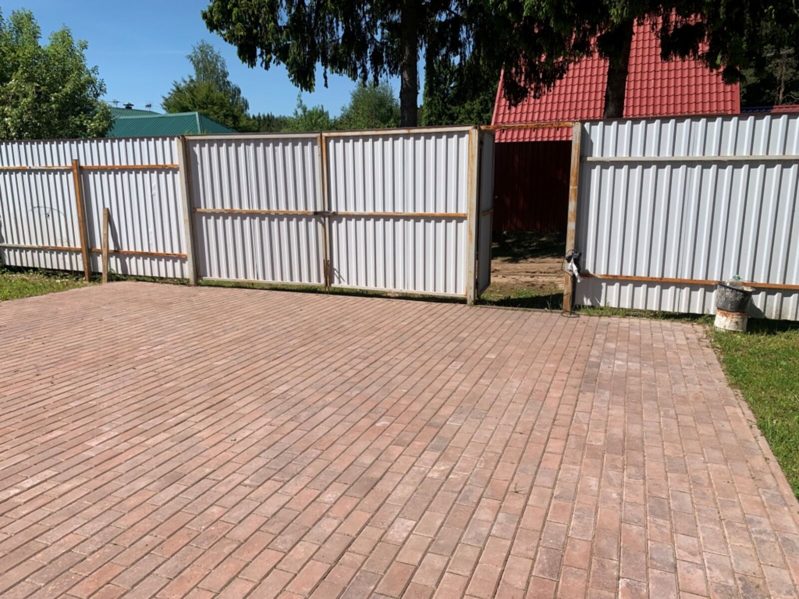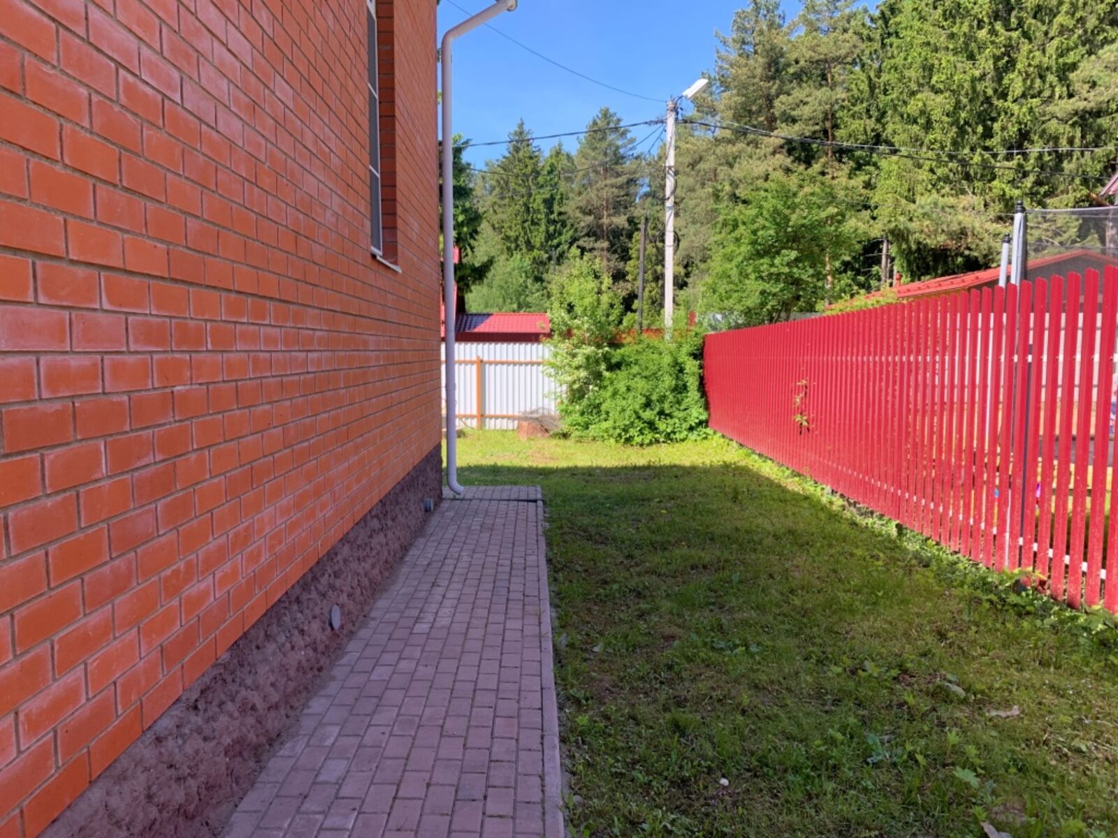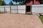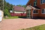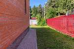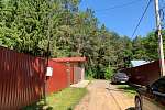 Участок отмежеван, правильной прямоугольной формы, огорожен забором (по фасаду сплошным), с воротами. На участке площадка перед домом и отмостка выложена брусчаткой, газон, плодово-ягодные кусты и яблоня.