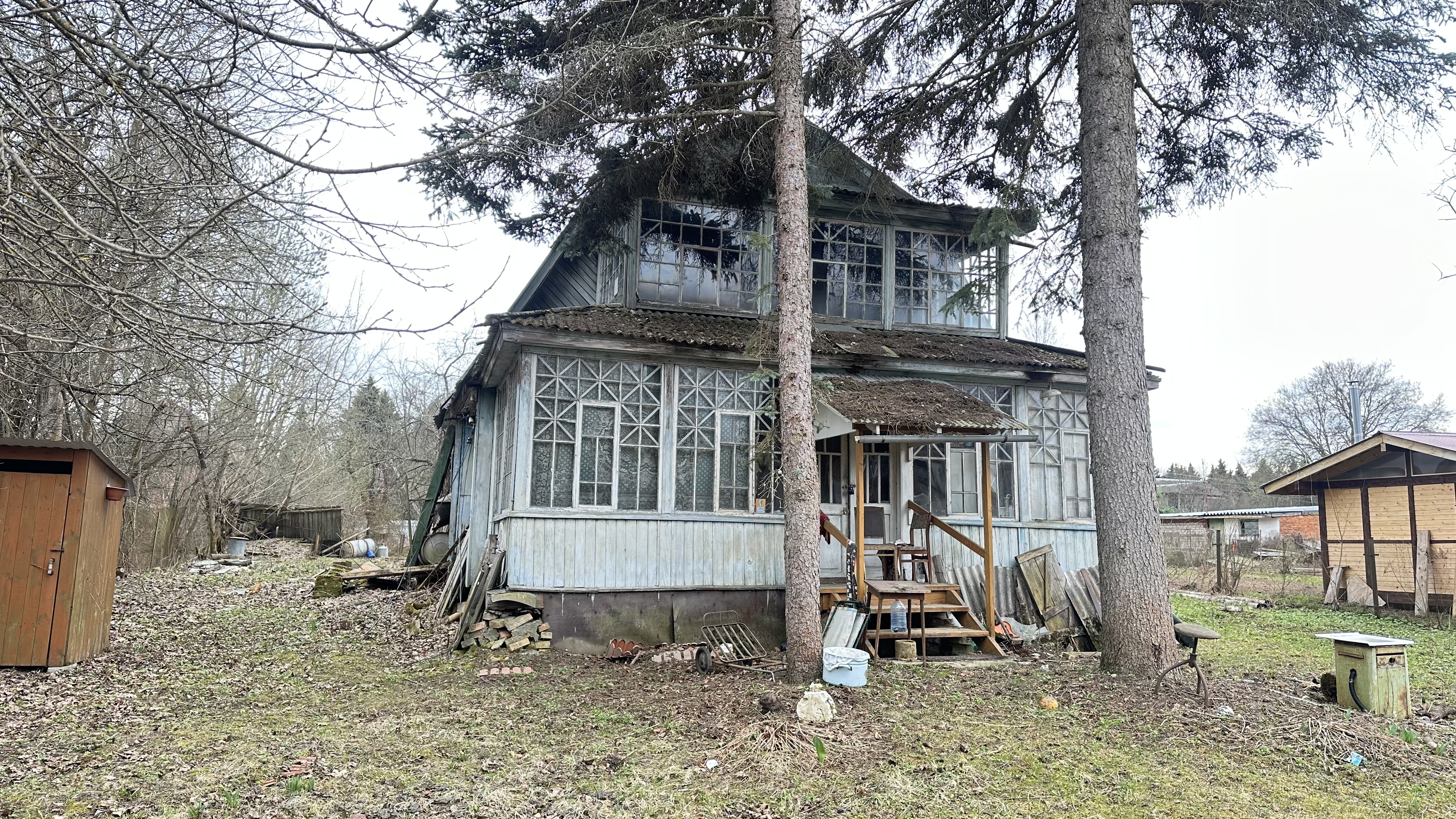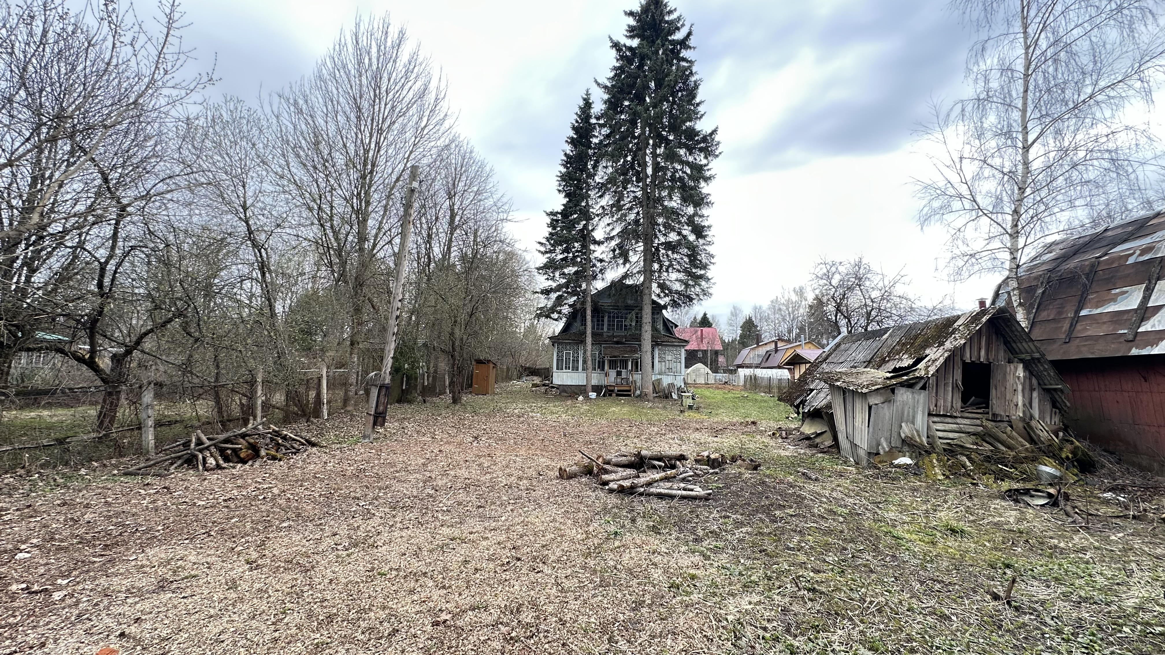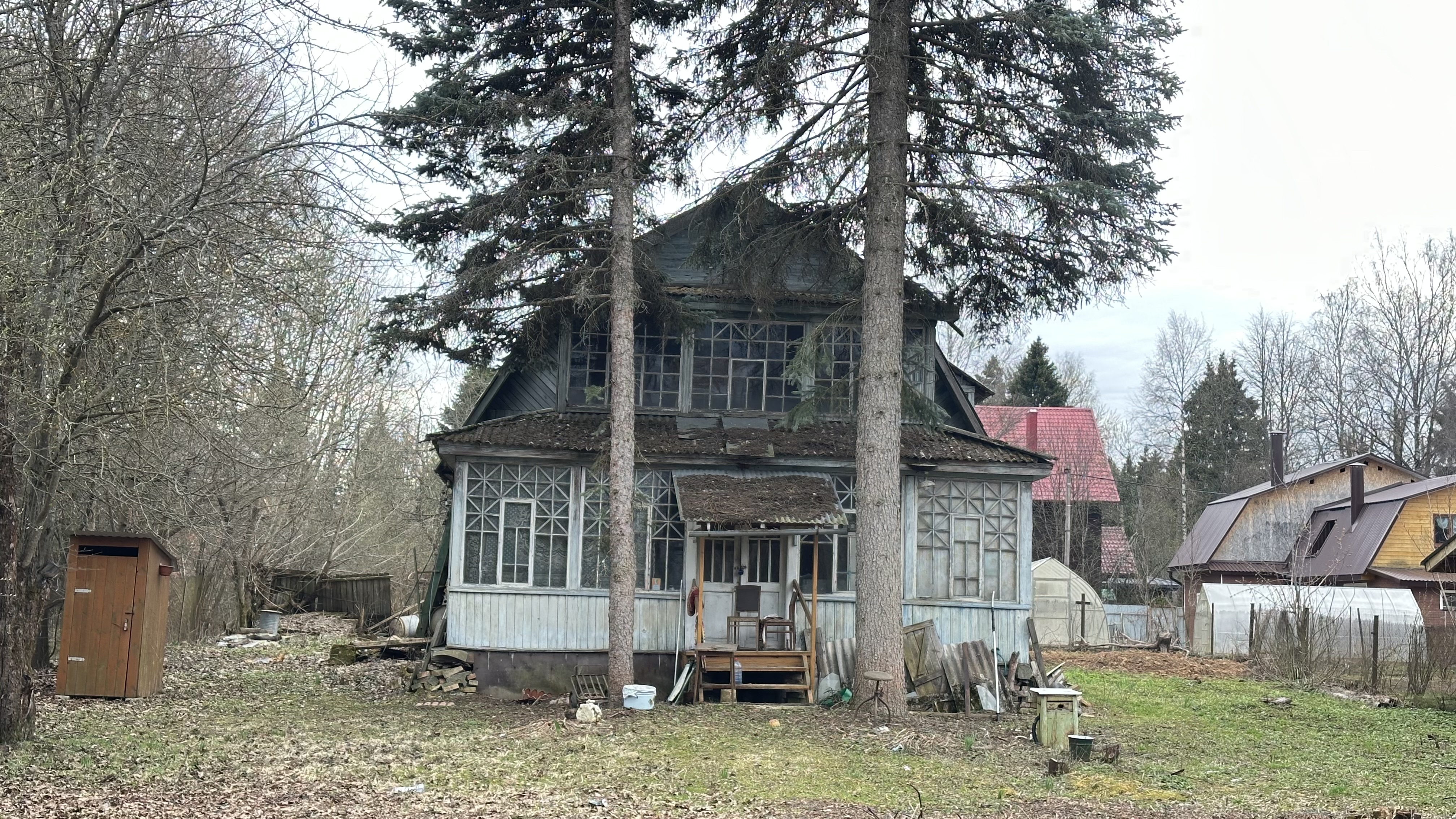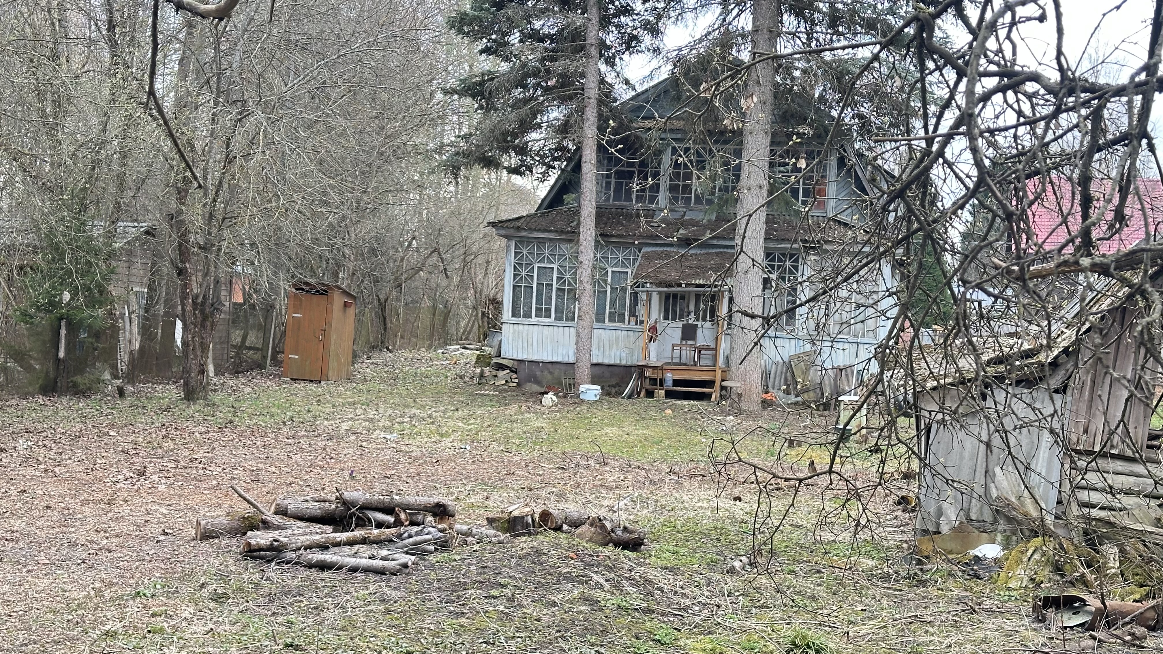 Участок отмежеван (его кадастровый номер 50:05:0050401:2001, ИЖС. Также на участке яблони и взрослые лесные деревья (две ели).