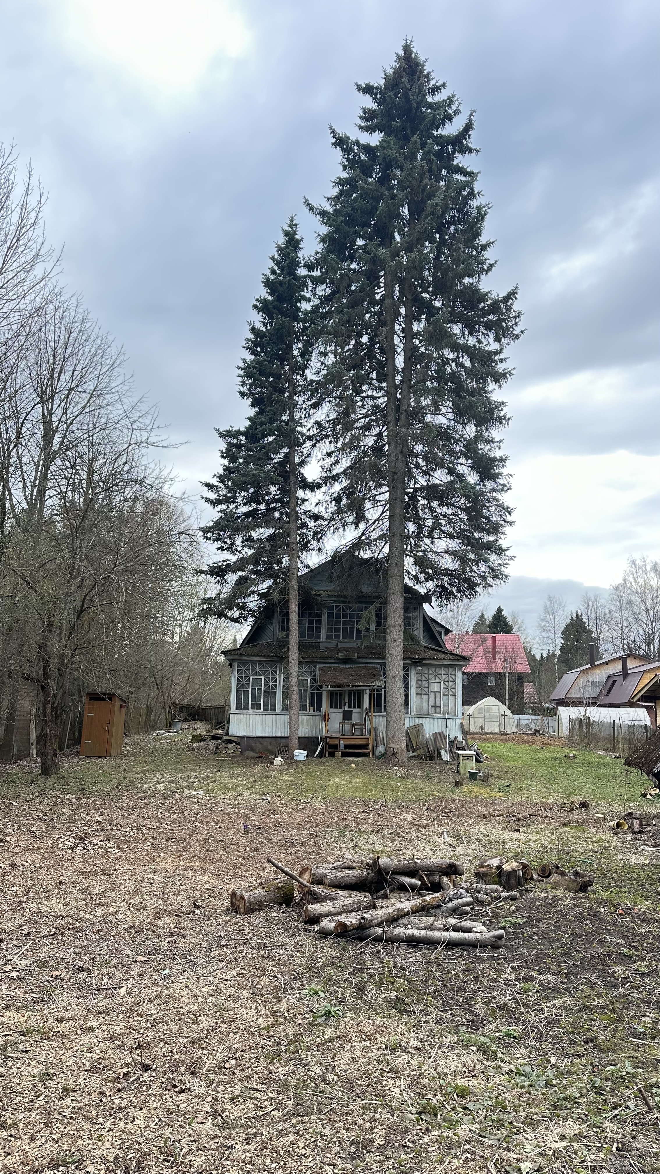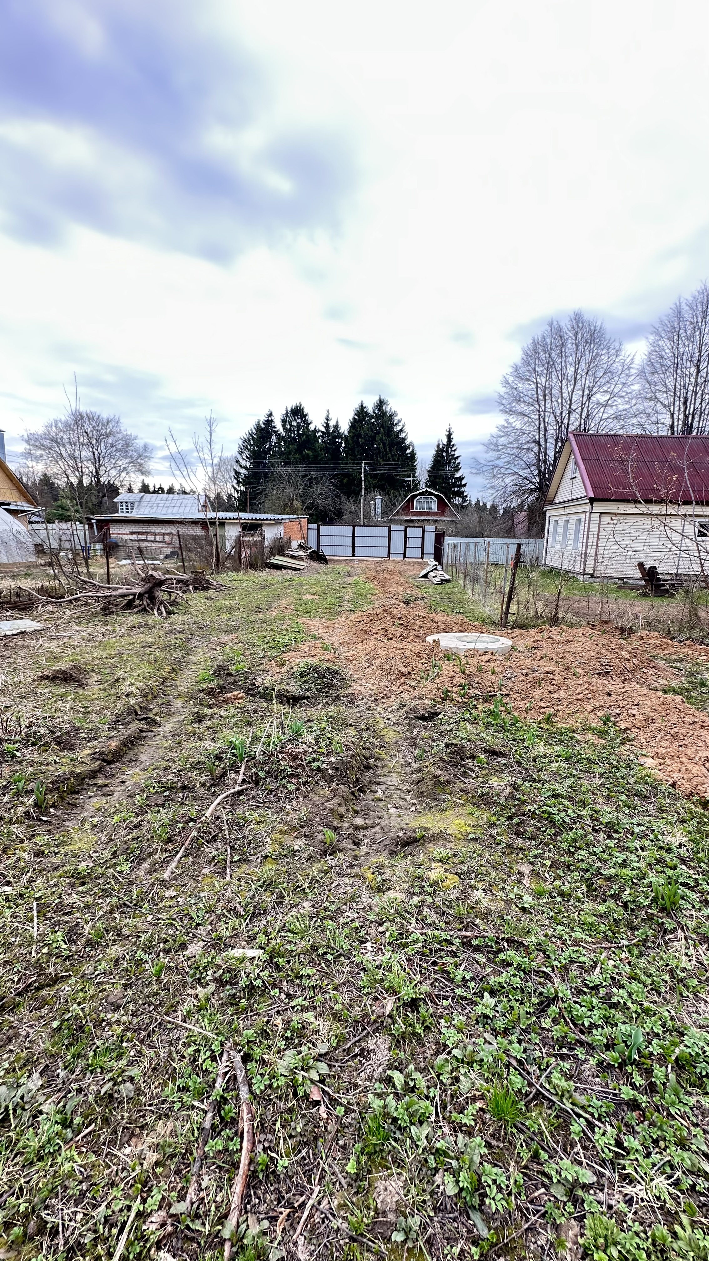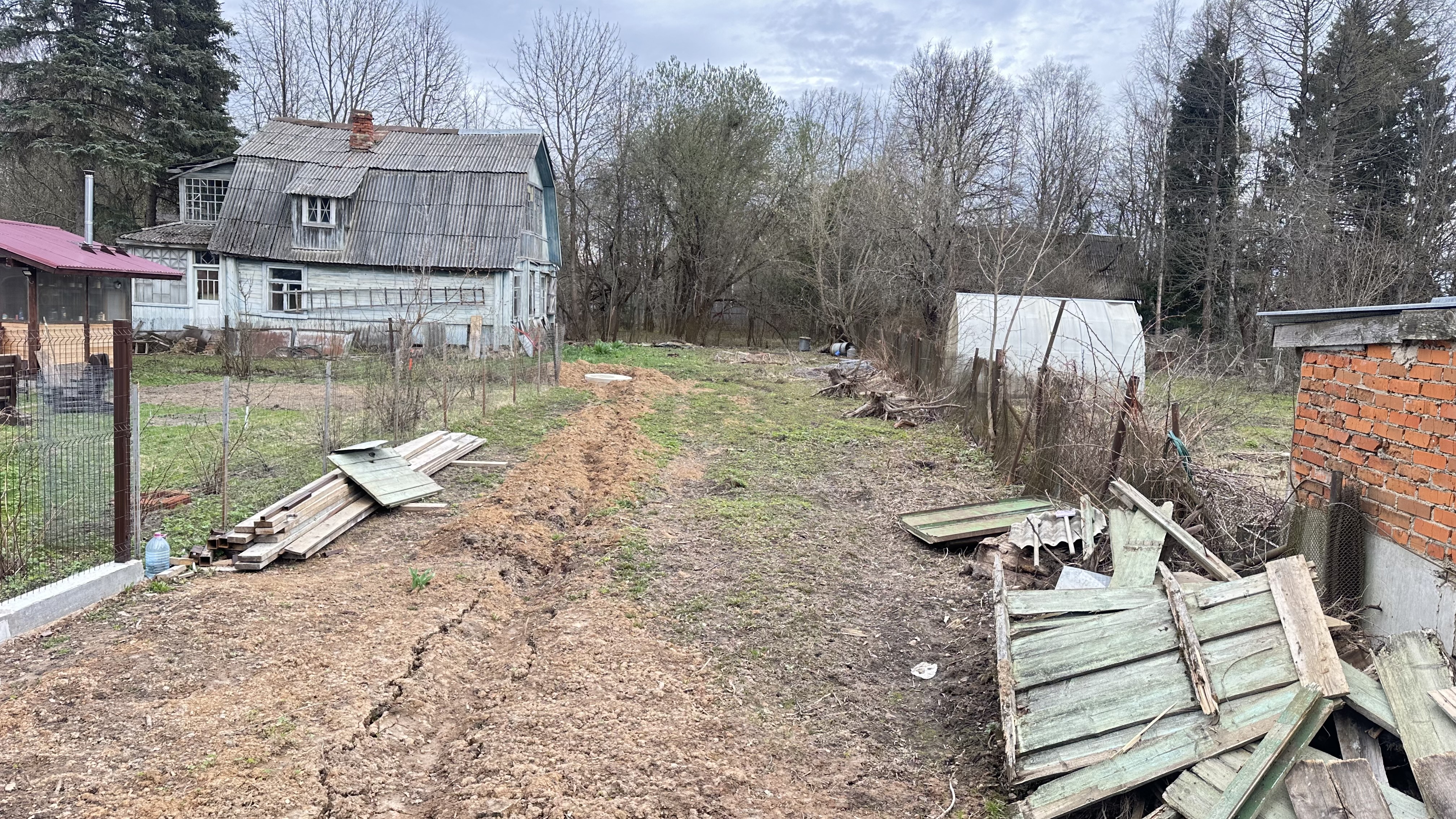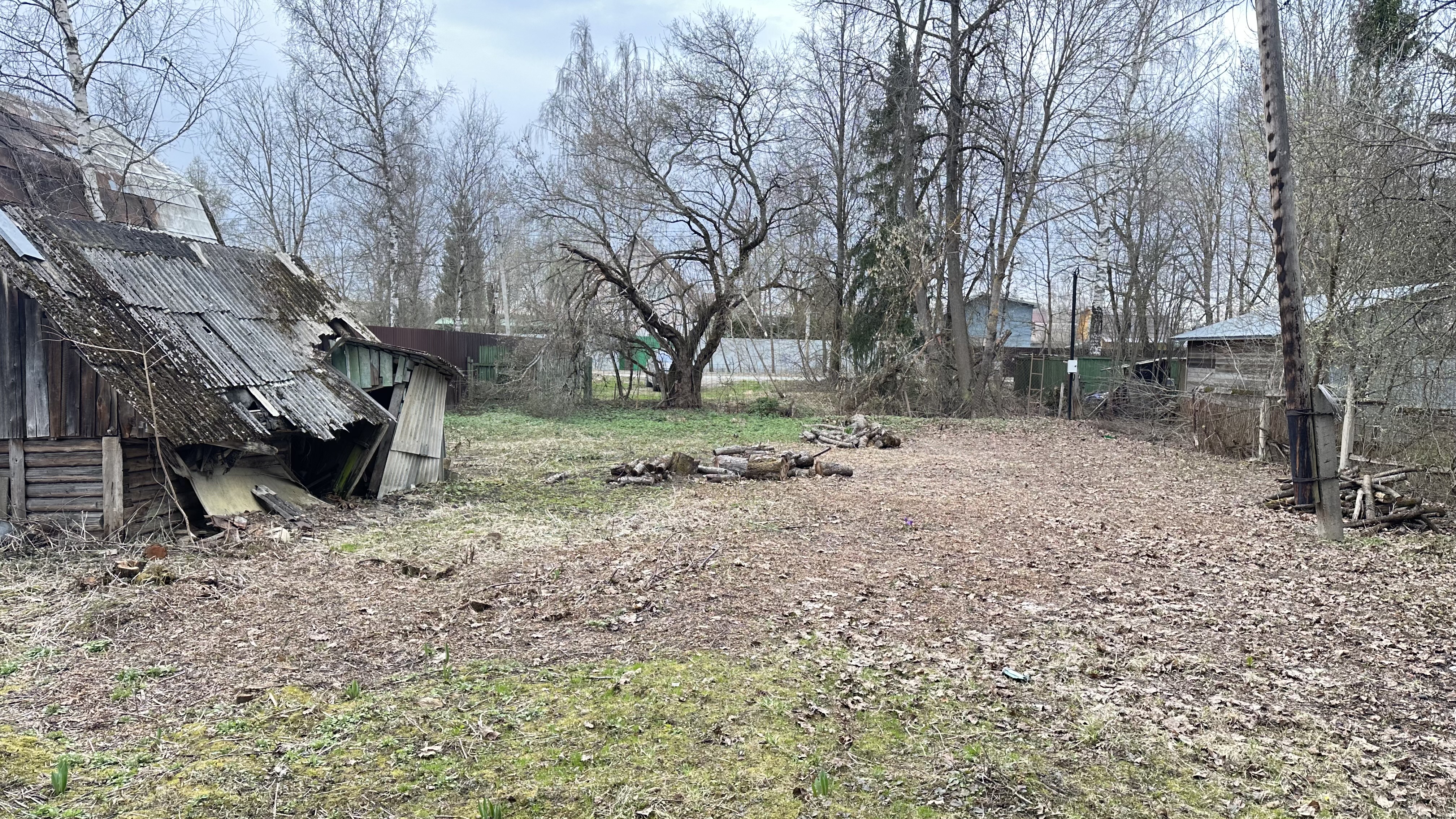 Участок отмежеван (его кадастровый номер 50:05:0050401:2001, ИЖС. Также на участке яблони и взрослые лесные деревья (две ели).