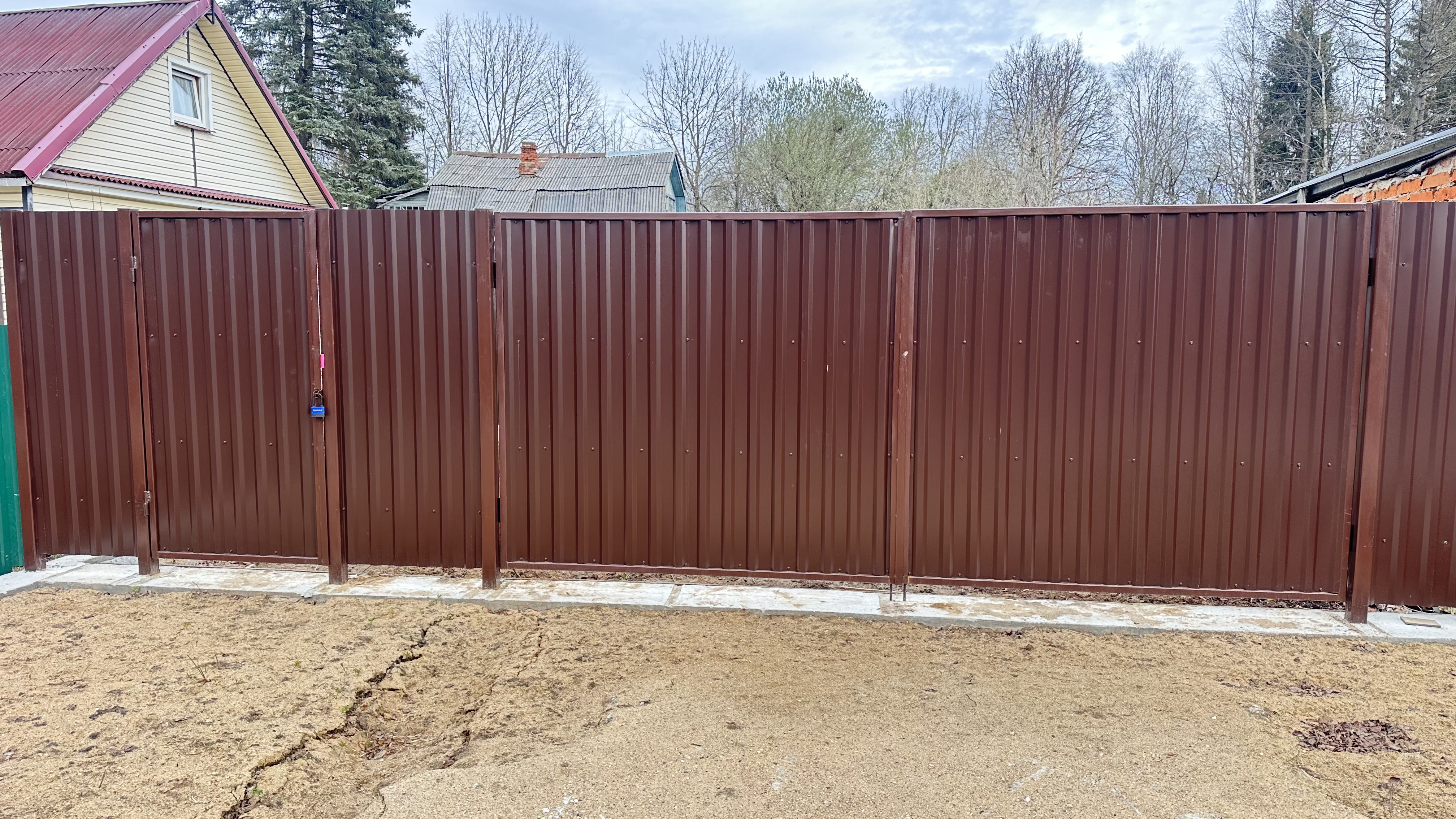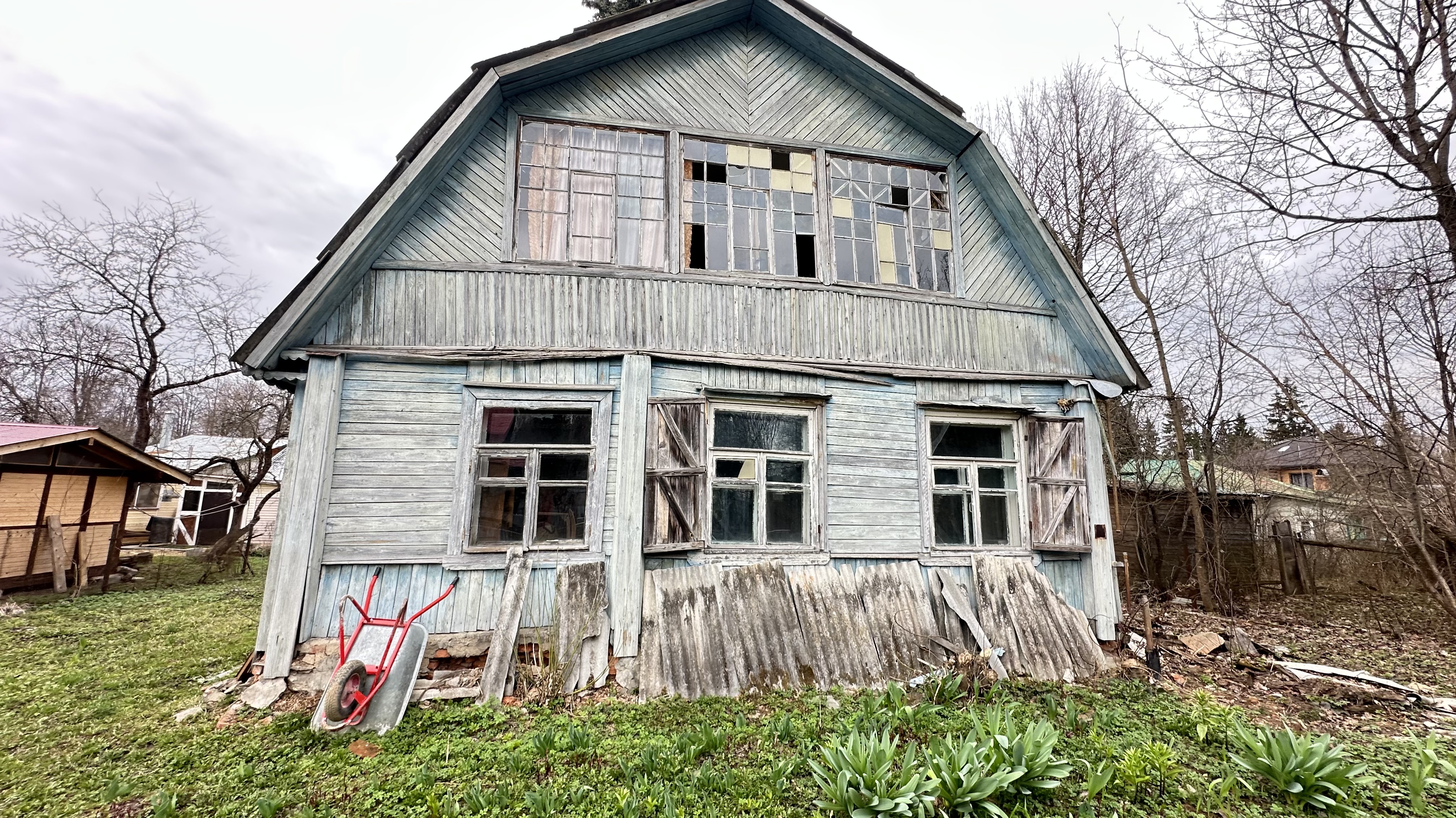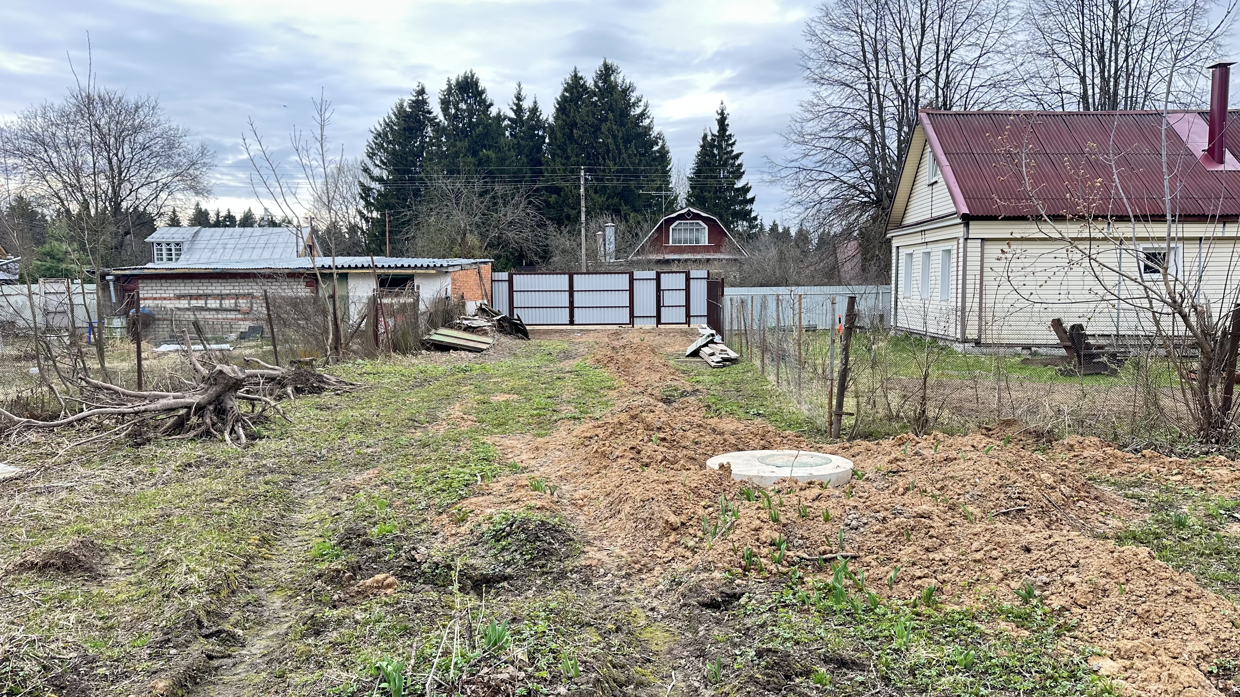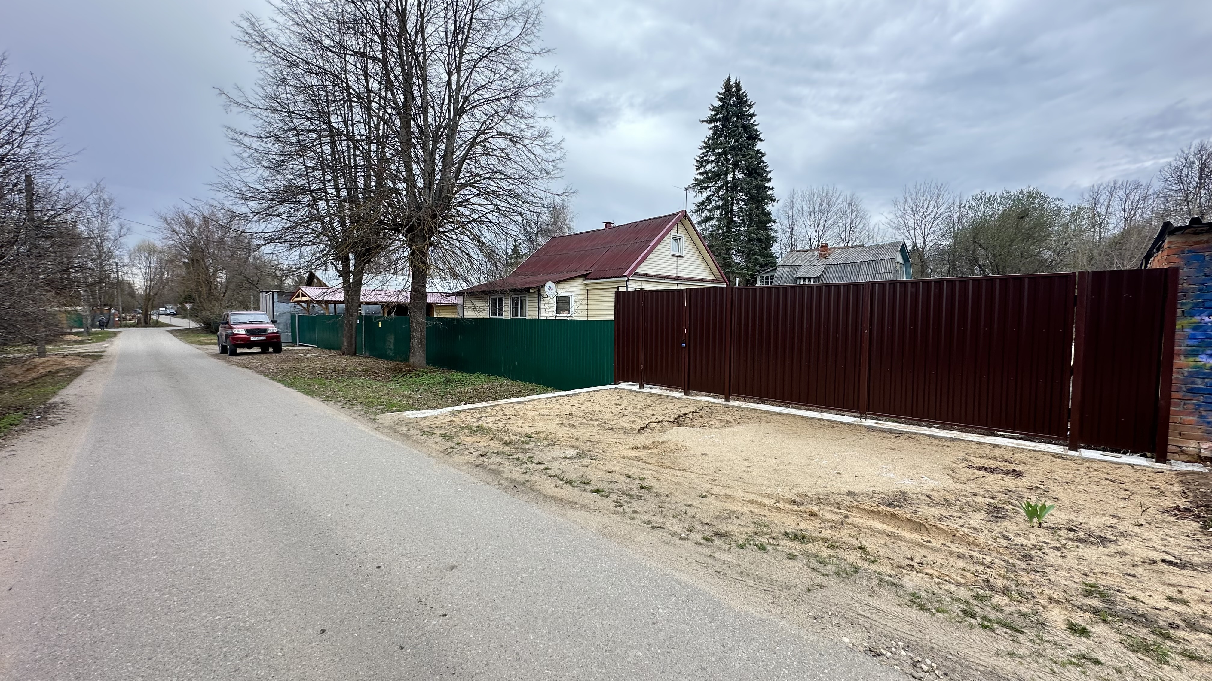 Участок отмежеван (его кадастровый номер 50:05:0050401:2001, ИЖС. Также на участке яблони и взрослые лесные деревья (две ели).