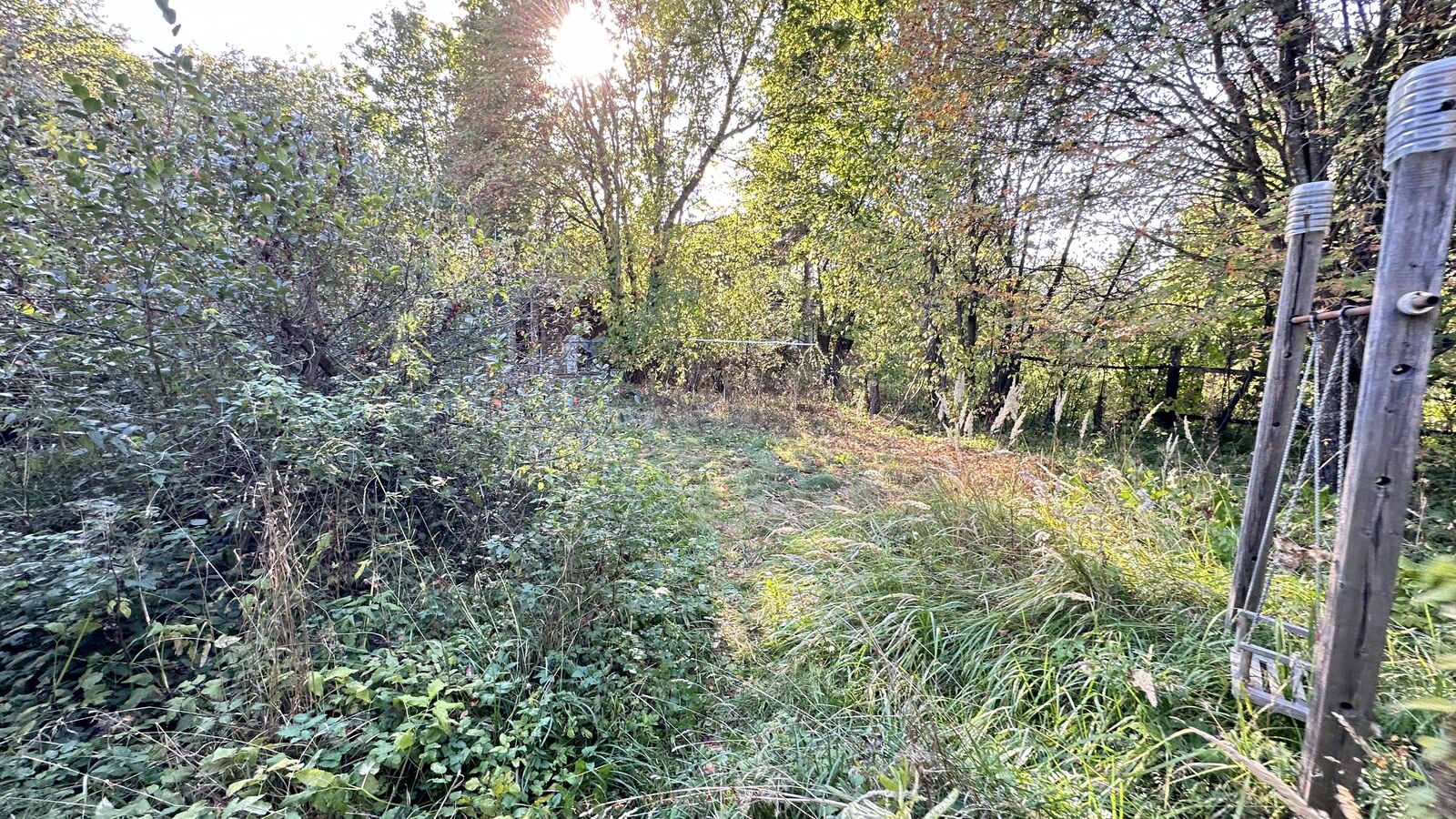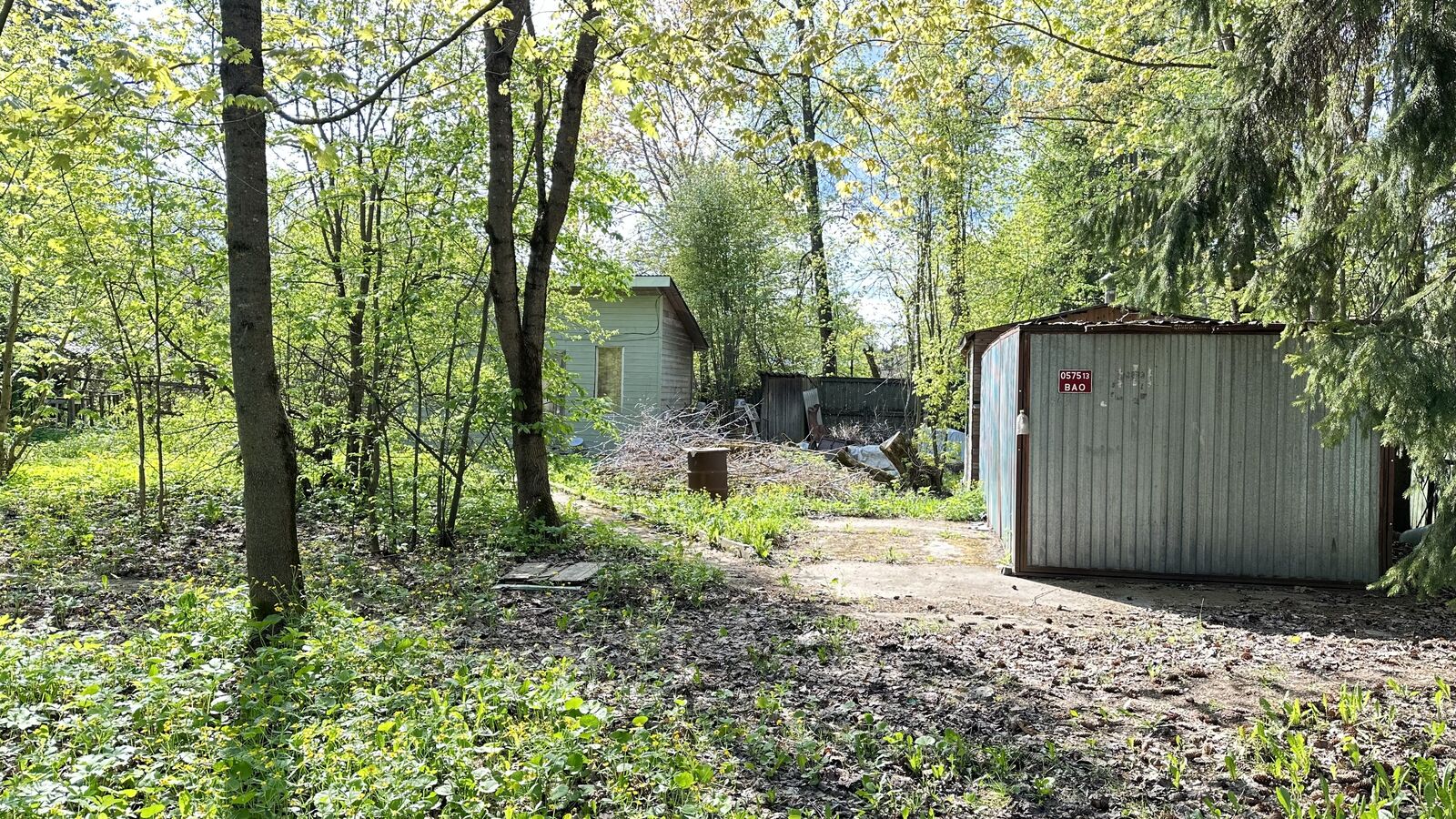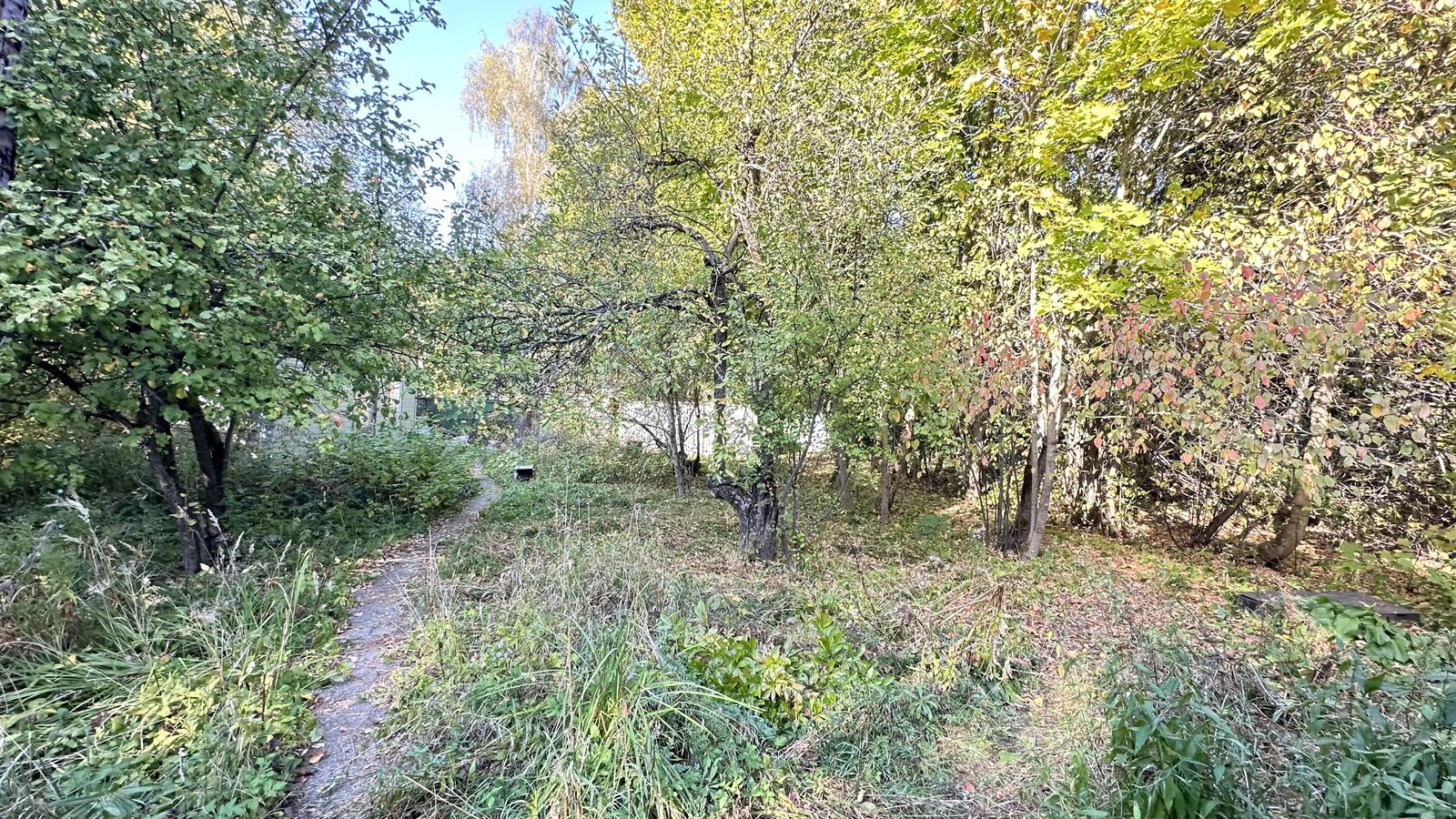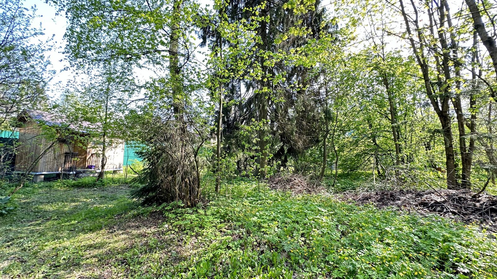 Участок отмежеван, прямоугольной формы, размером 48х43 м, ИЖС, огорожен забором. Также на участке яблони и взрослые лесные деревья.